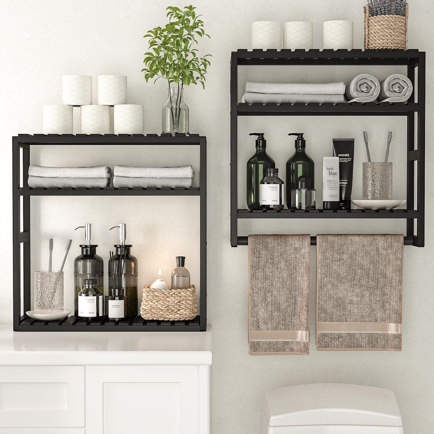 • Nice bamboo wall shelving for smaller, lightweight accessories.It holds extra hand towels and other assorted items you would like handy. Allows youto use it for storage but also as a decor piece. The shelf comes in different colors so will fit in with many decorsVery cute.It goes with semi-boho chic themed bathroom.
