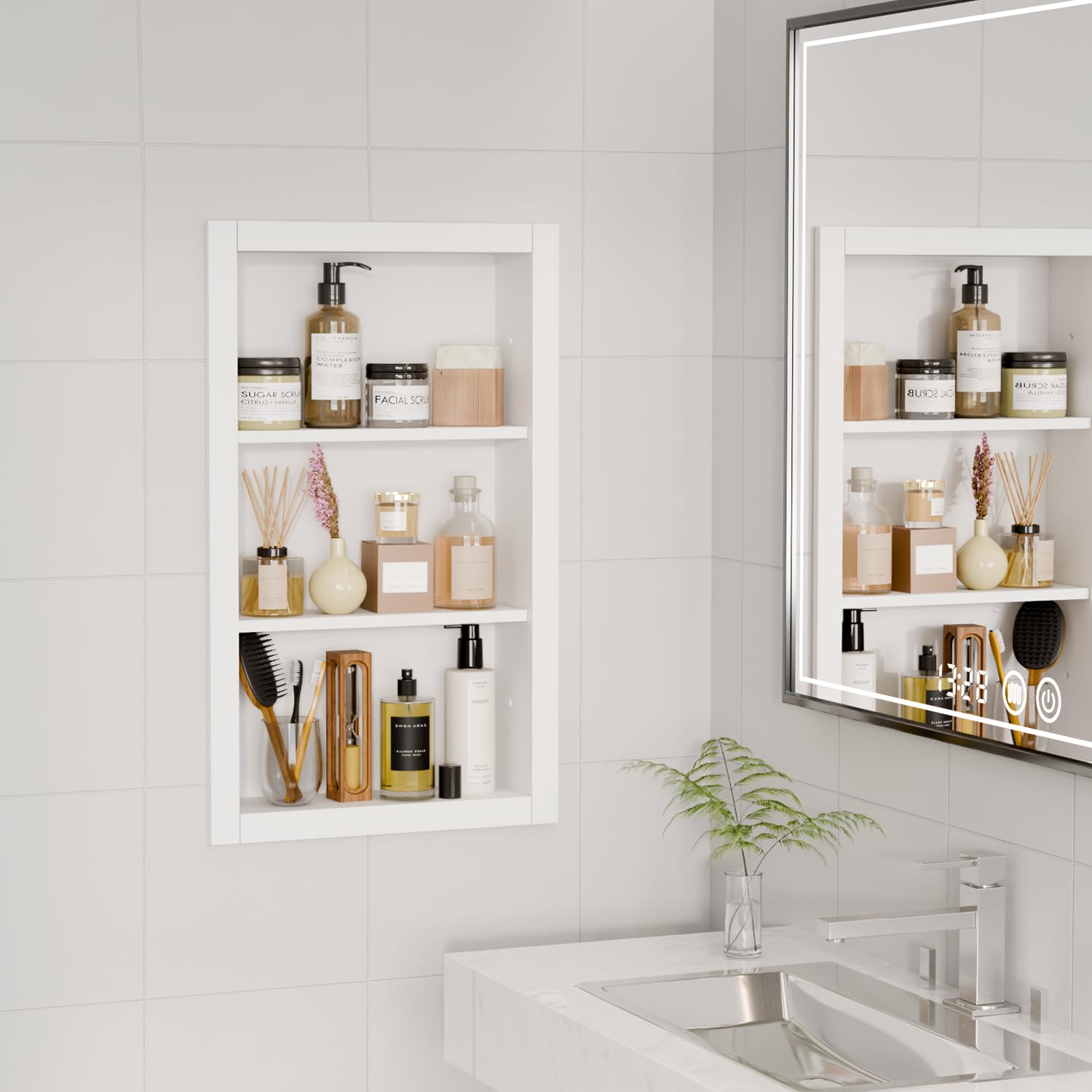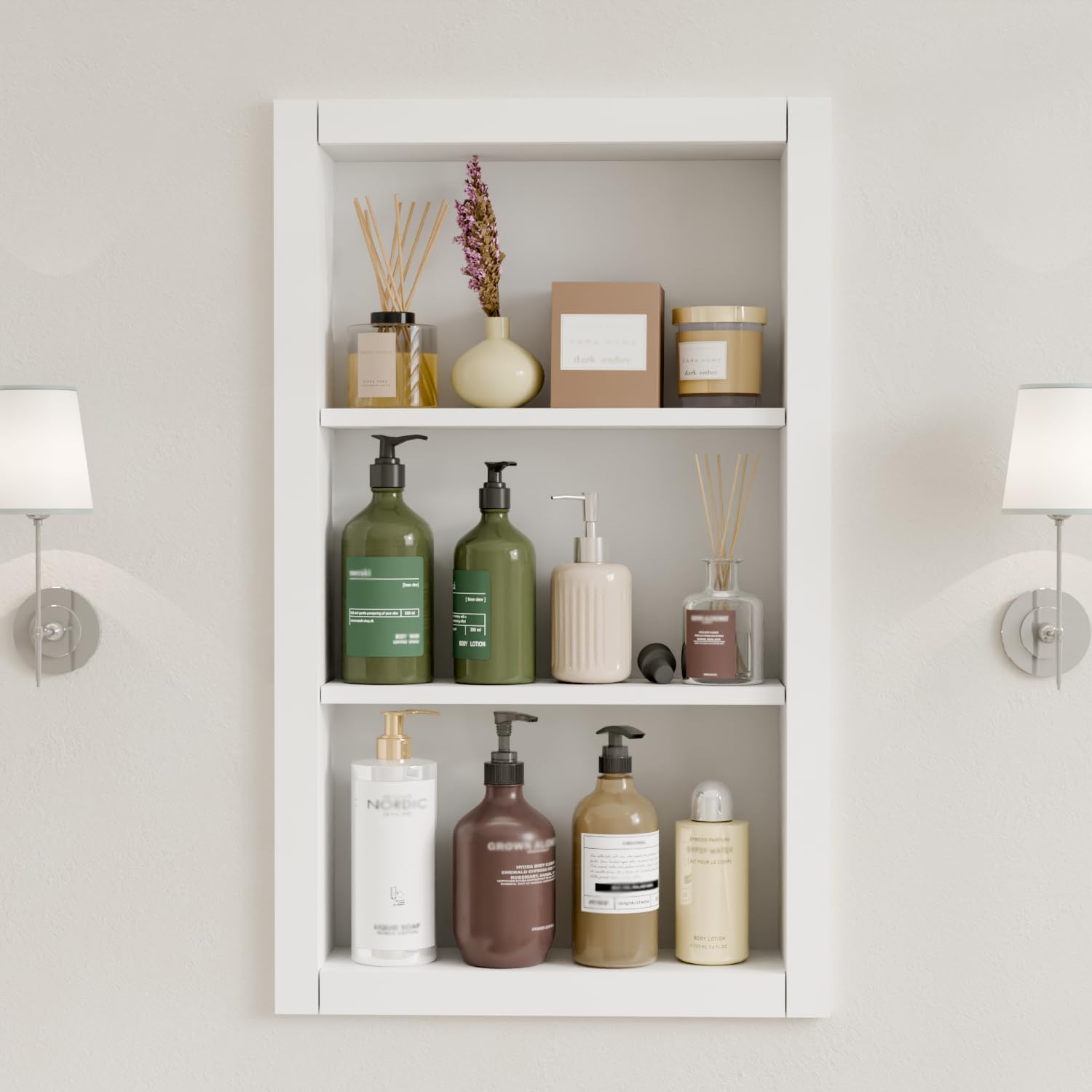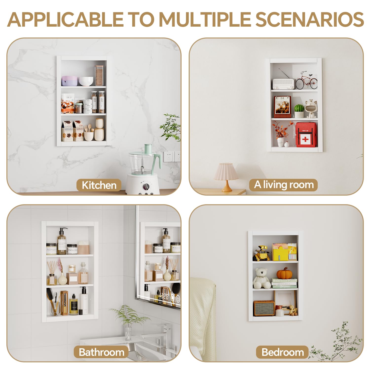 HAIDAIYA 14'' * 24'' Recessed Medicine Cabinet Wall Niche Wood, 3-Tier Bathroom Niche Insert for Drywall, in Wall Shelf Medicine Cabinets Replacement, for Living Room, Bathroom Storage, White