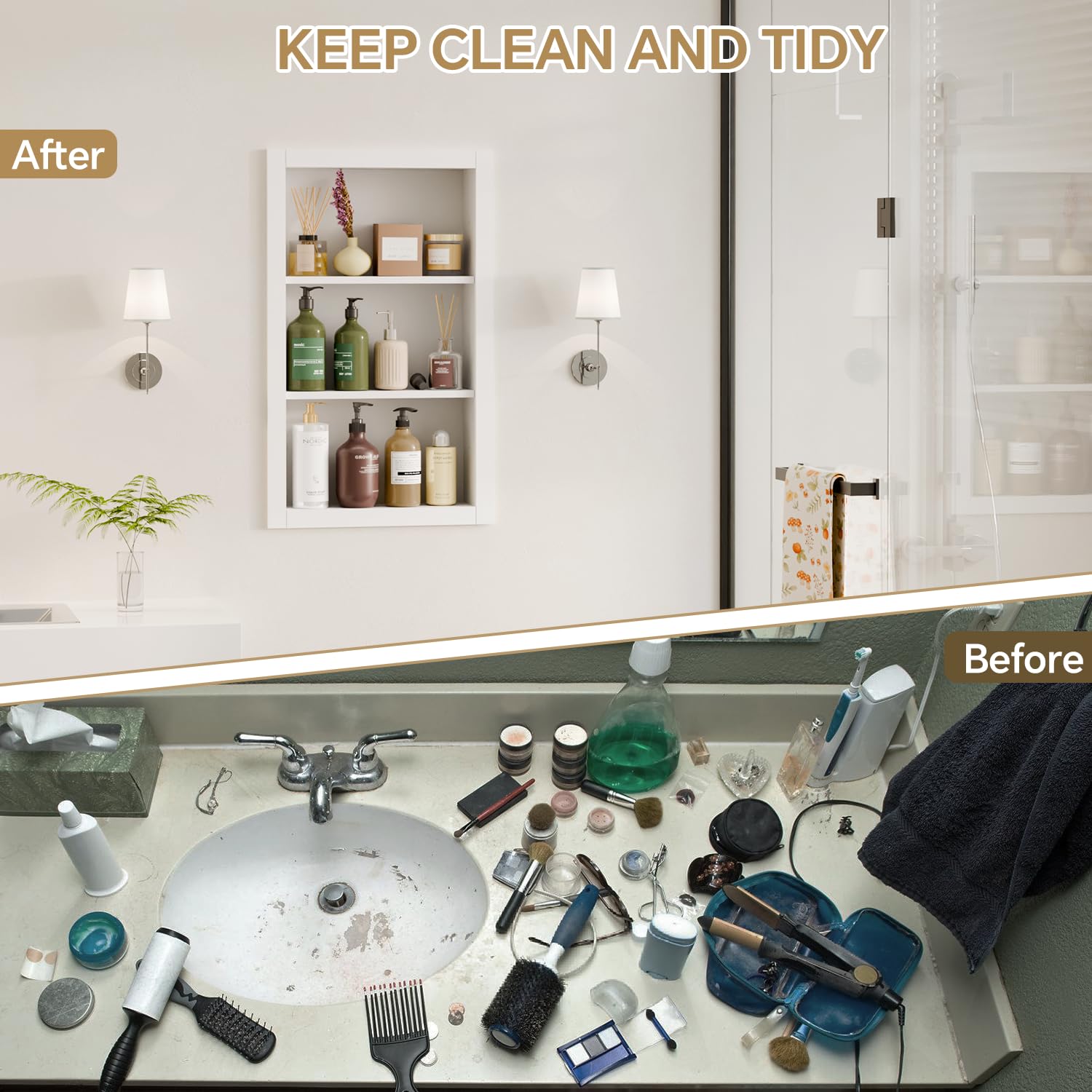- Waterproof & Durable: Surface waterproof, this recessed shelf protects toiletries and meds. Durable construction prevents wear and moisture damage. Maintains elegance while guarding essentials in showers or steamy bathrooms. Worry-free longevity guaranteed!