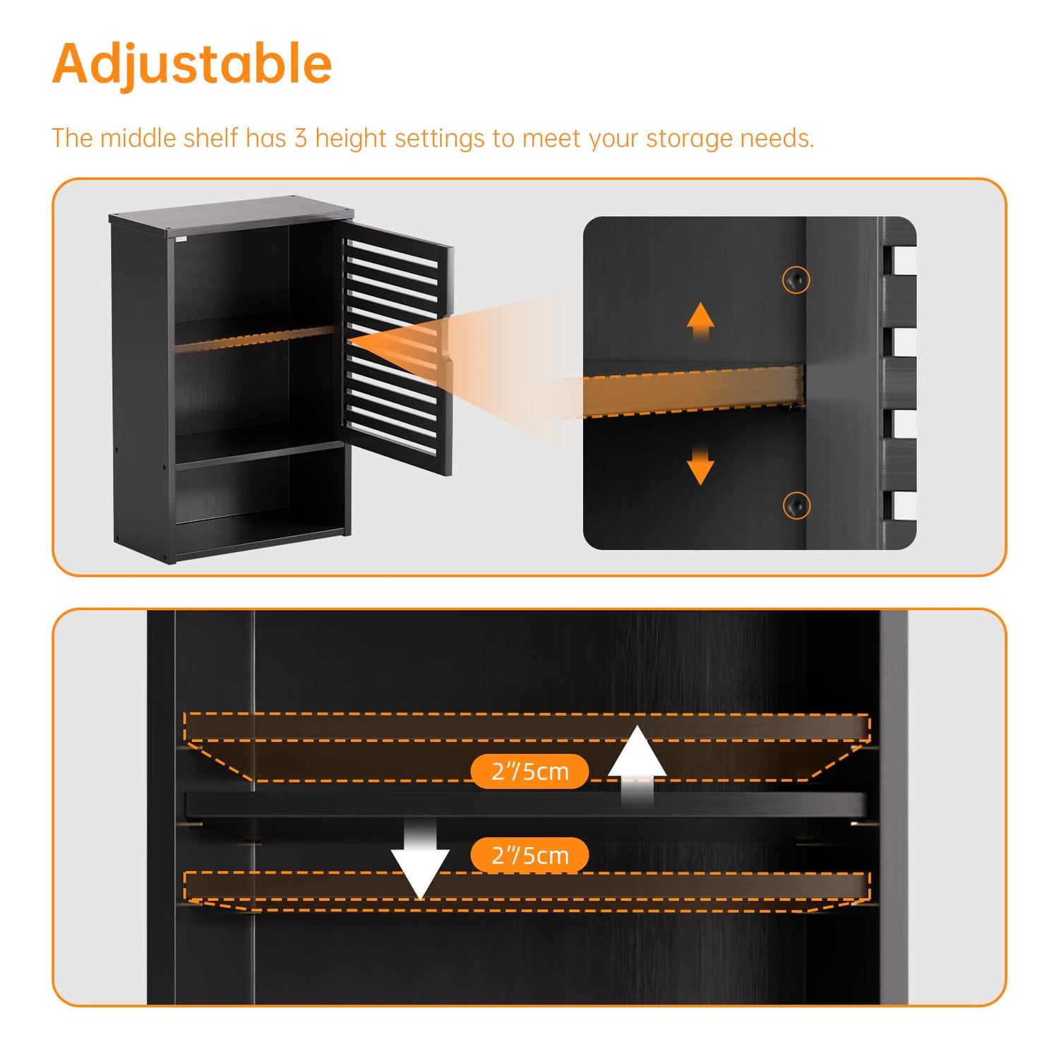 - ADJUSTABLE SHELF – 3 install positions, adjustable middle shelf, this bathroom wall cabinet can be moved up or down for needed storage heights. Roomy space and flexible storage solution, make it easy to meet your daily necessity for bathroom essentials, medicines, and kitchen utensil sets