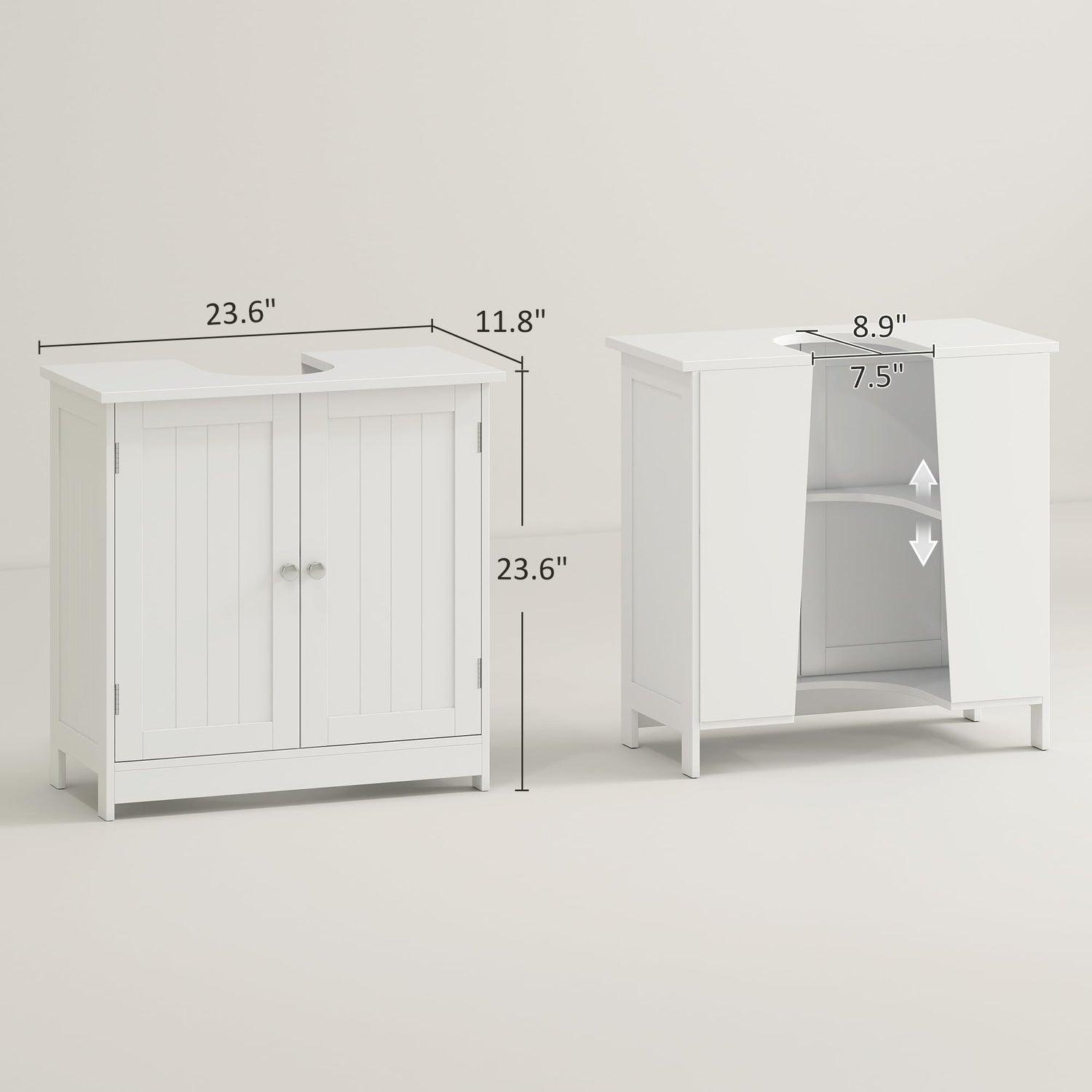 • Space Saving: This bathroom sink cabinet is designed to sit under your open sink with a U-shaped design to maximize storage space. U-shape opening slot size: 8.75"L x 7.5"W. Suitable for pedestal or wall-mounted sinks.