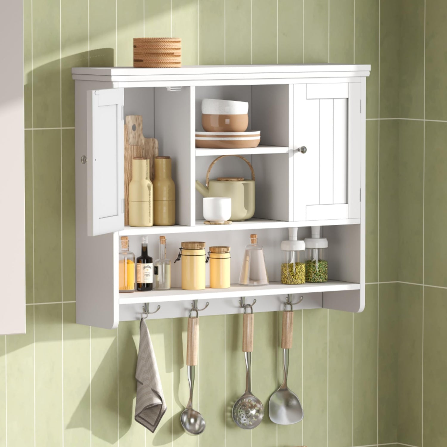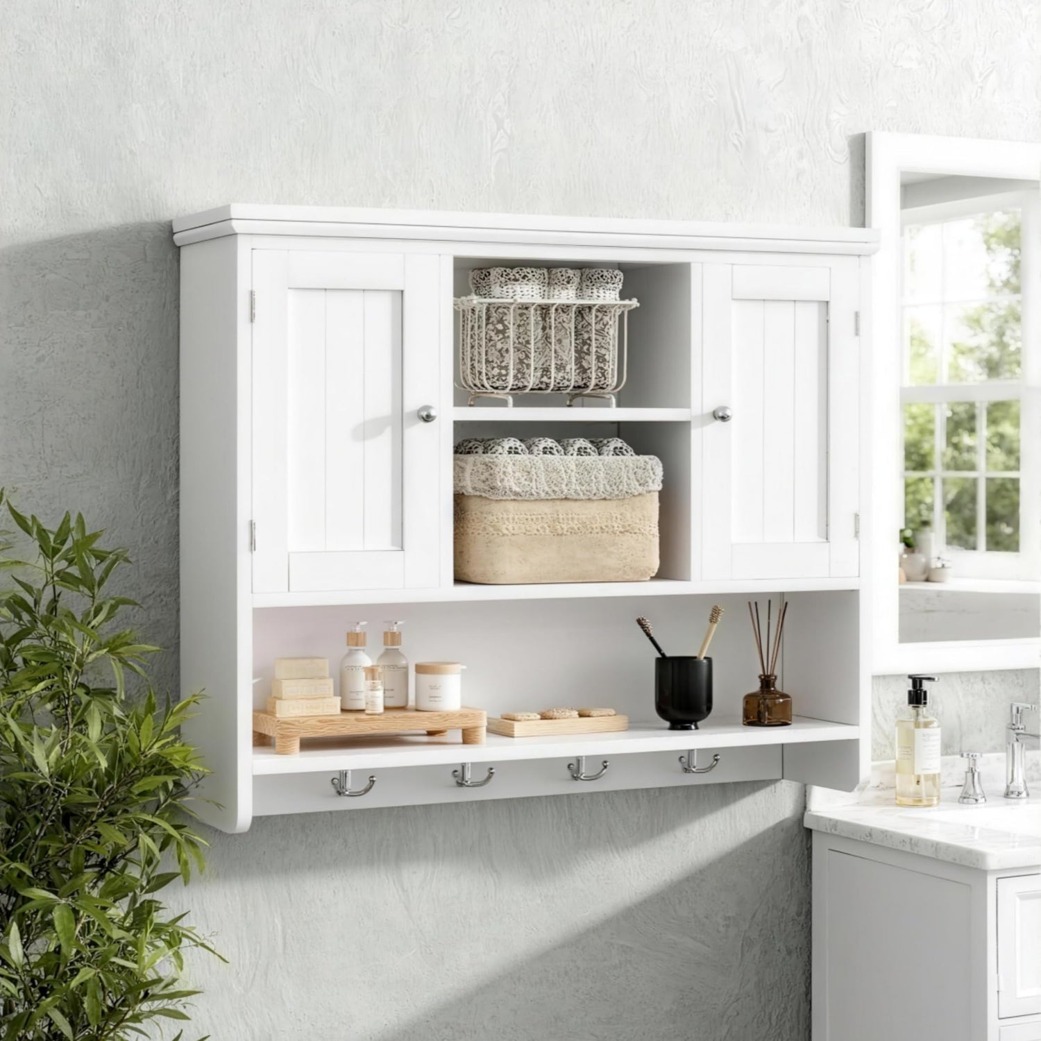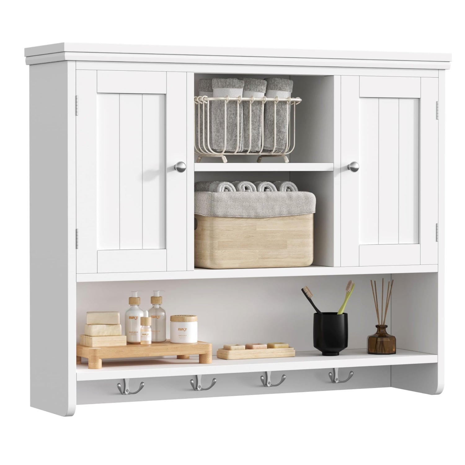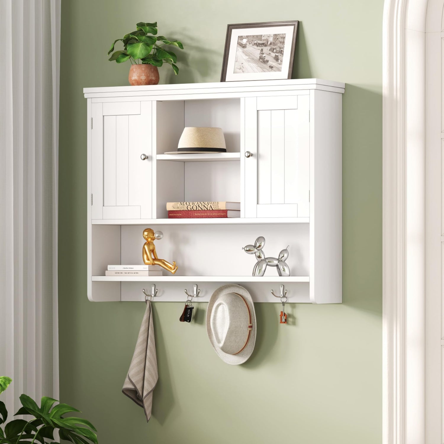 Irontar 31.5" L Large Medicine Cabinet with 4 Hooks, Wooden Bathroom Wall Cabinet with Shelf, Modern Hanging Cabinet Over Toilet, Lined Door, for Living Room, Entryway, Kitchen, White