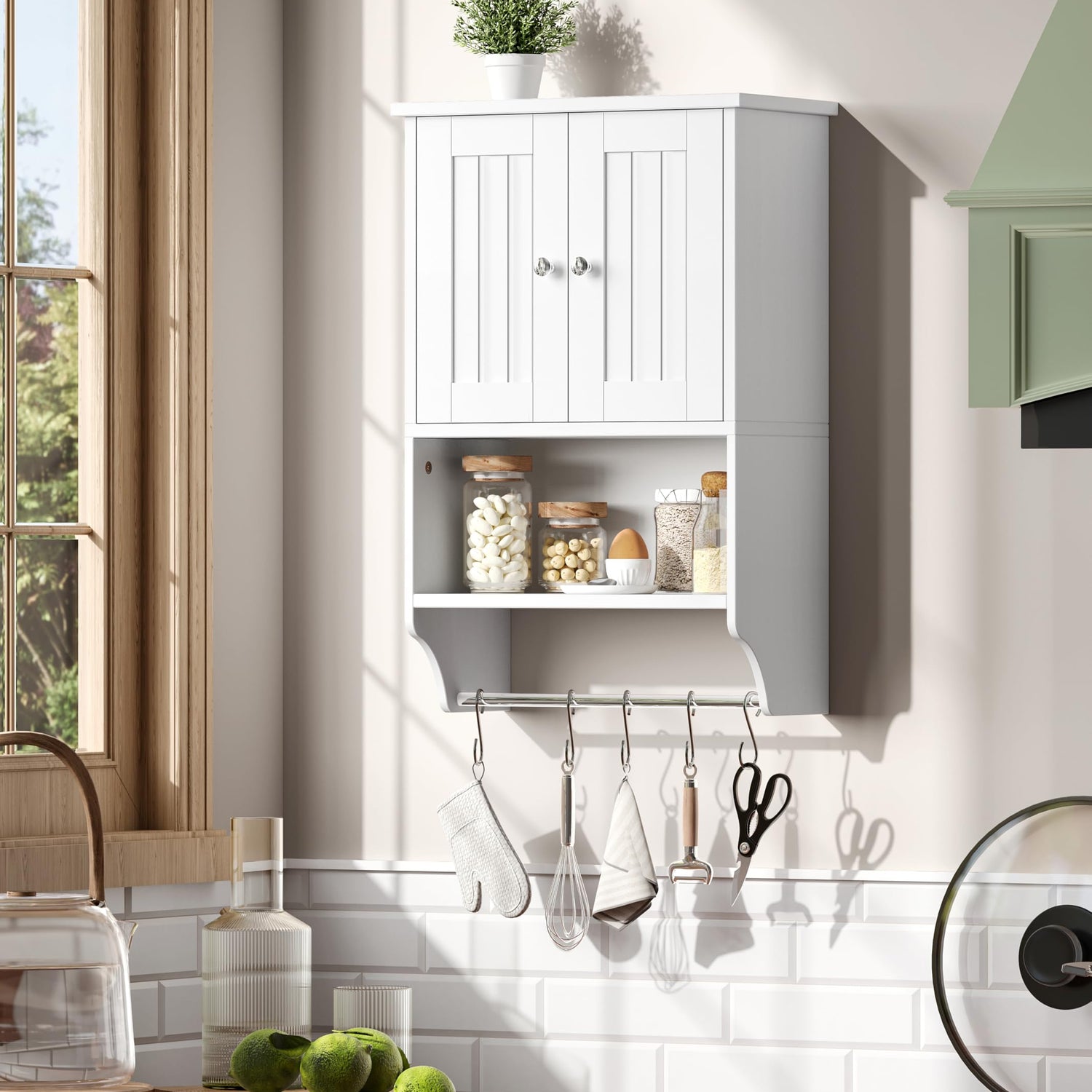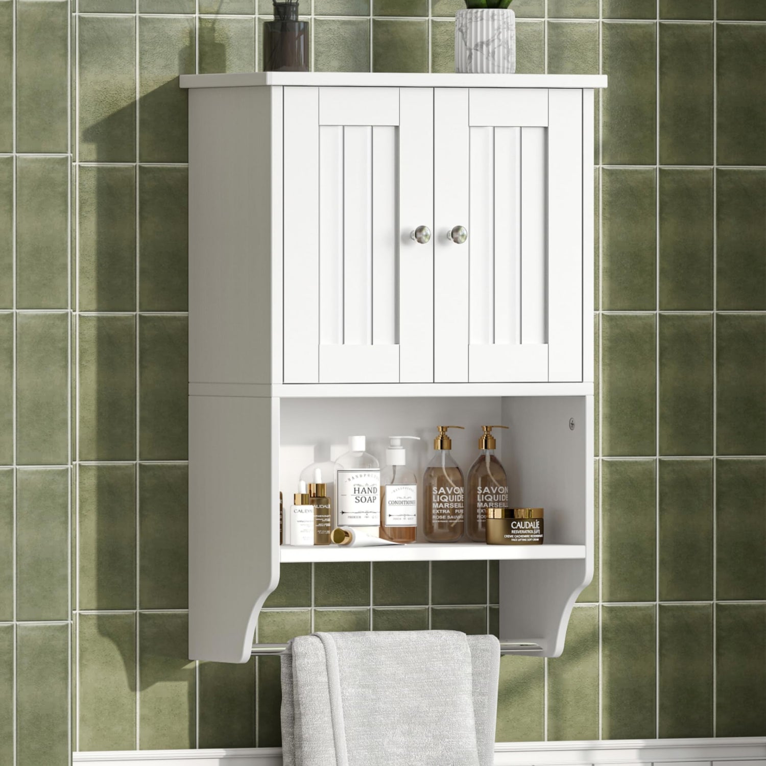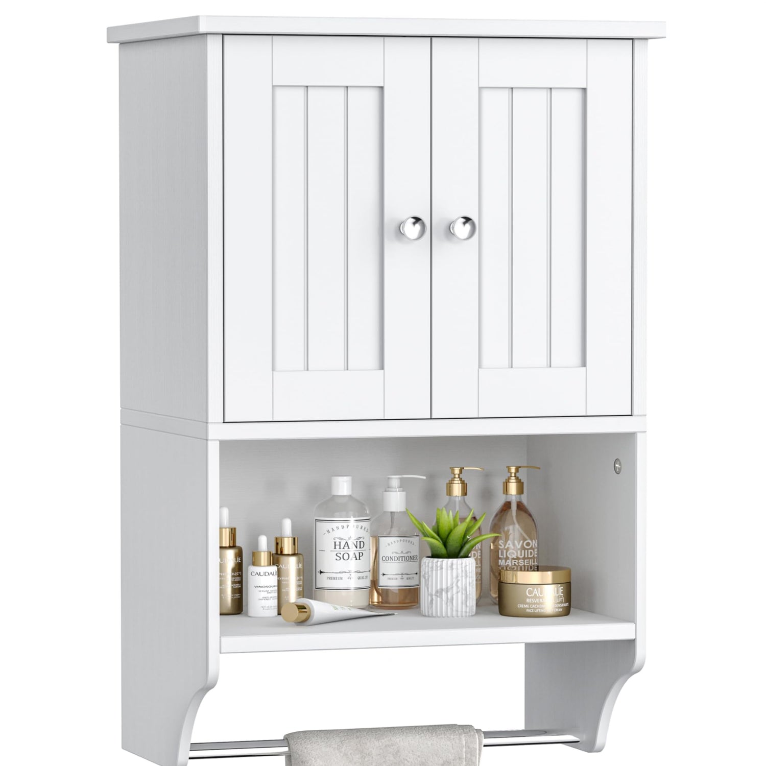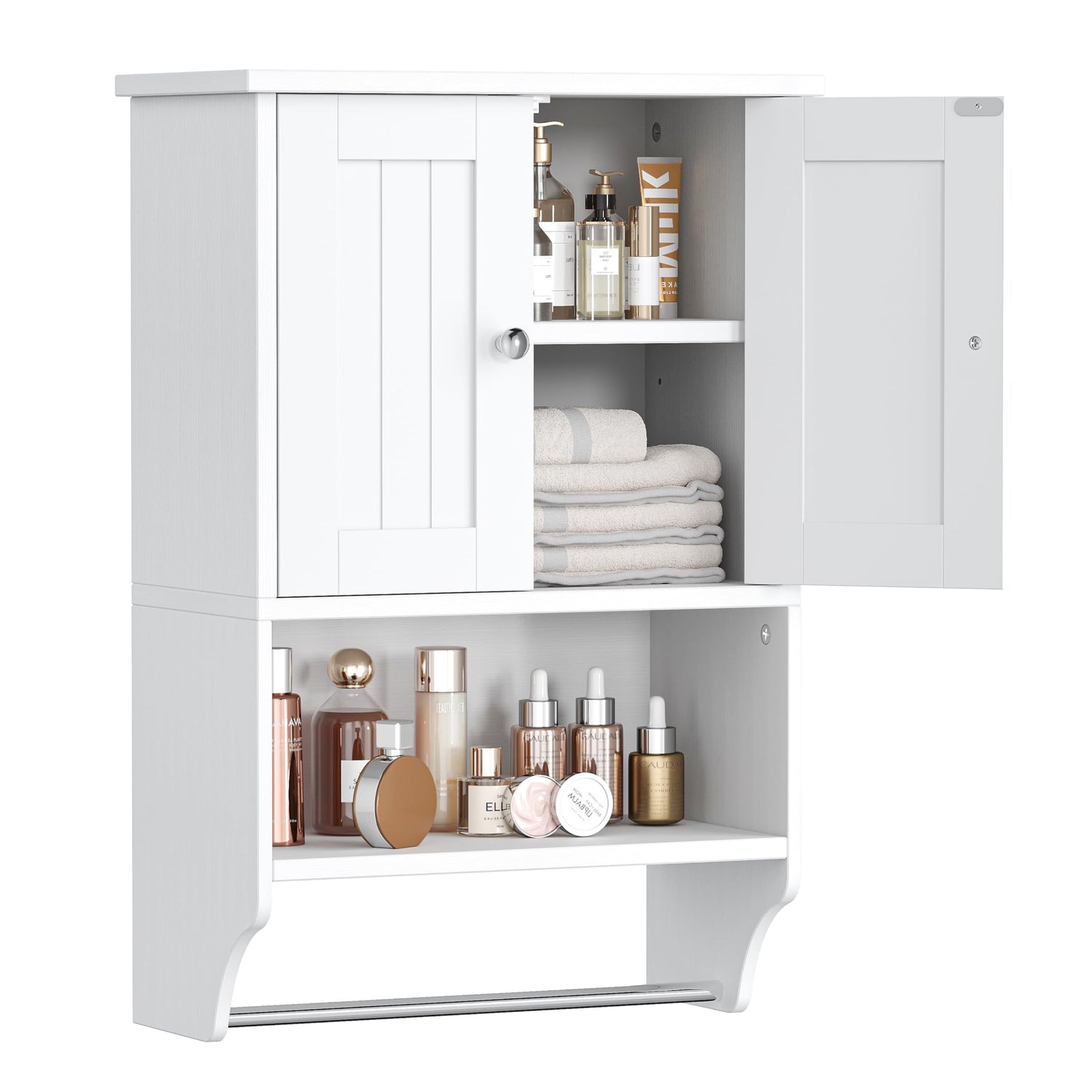 Irontar Small Medicine Cabinet with Towel Bar, Modern Bathroom Wall Cabinet with 2 Lined Doors, Over the Toilet Storage Cabinet with Adjustable Shelf, for Bathroom, Living Room, Kitchen, White CWG018W