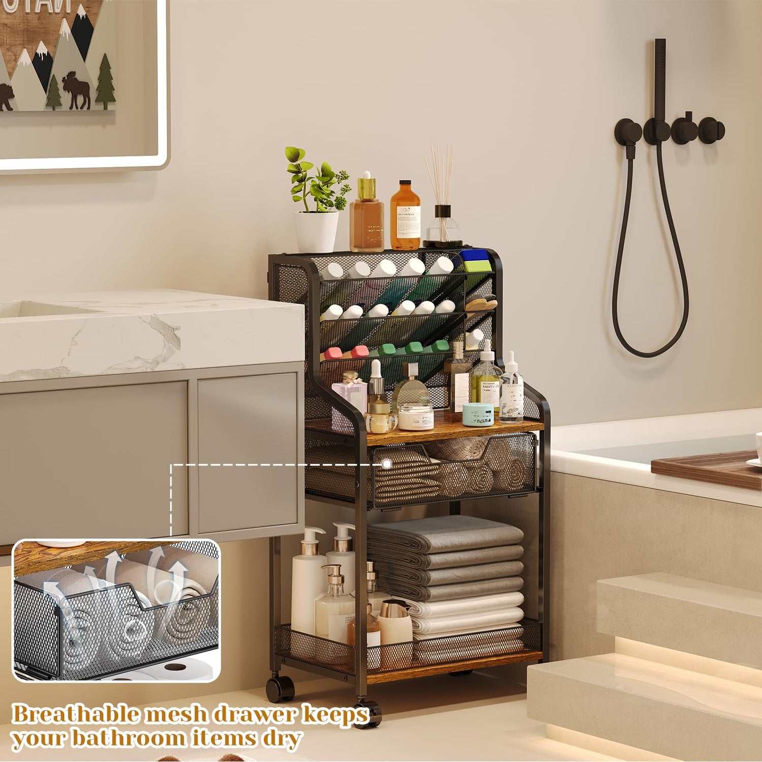 - 【Durable Metal Frame with Mesh Drawer】Crafted from heavy-duty metal, this bathroom cart on wheels features a breathable mesh drawer that promotes air circulation to keep towels, tissues, and toiletries dry. The sturdy metal construction ensures stability and long-lasting use, especially in humid bathroom environments.