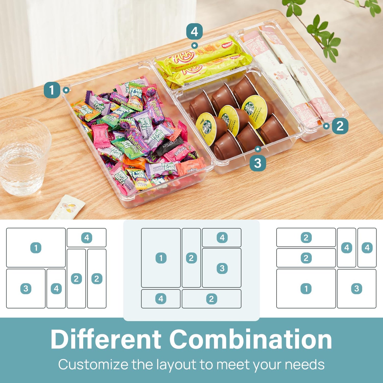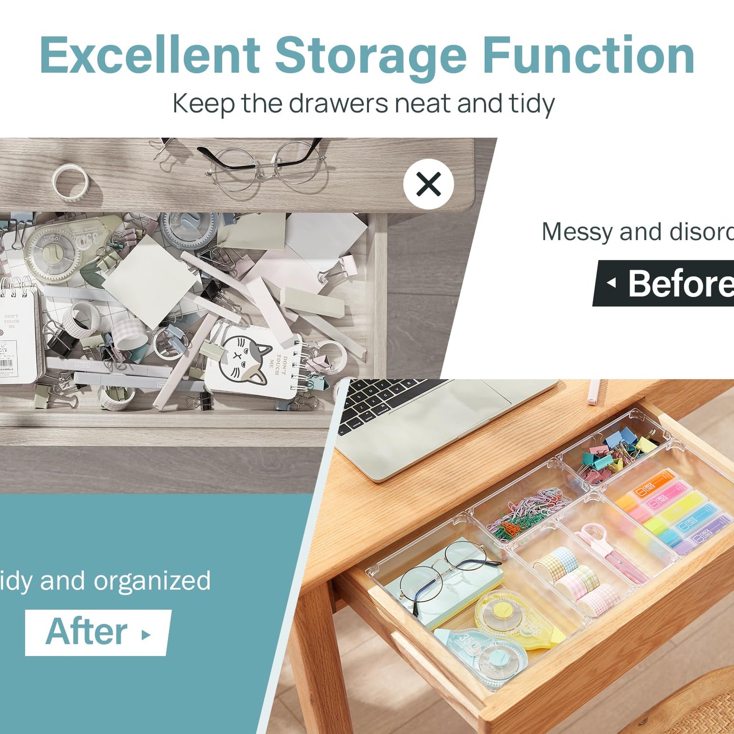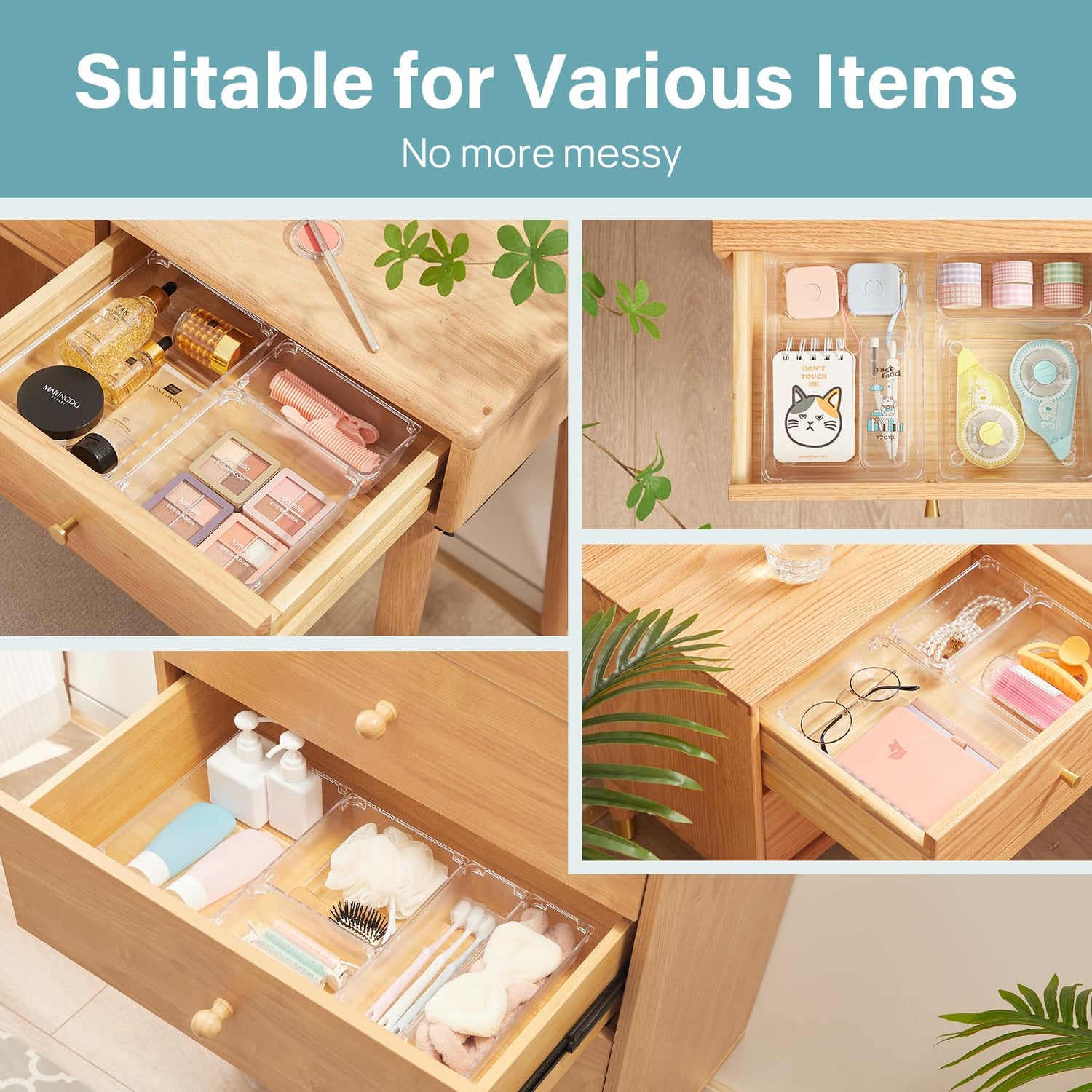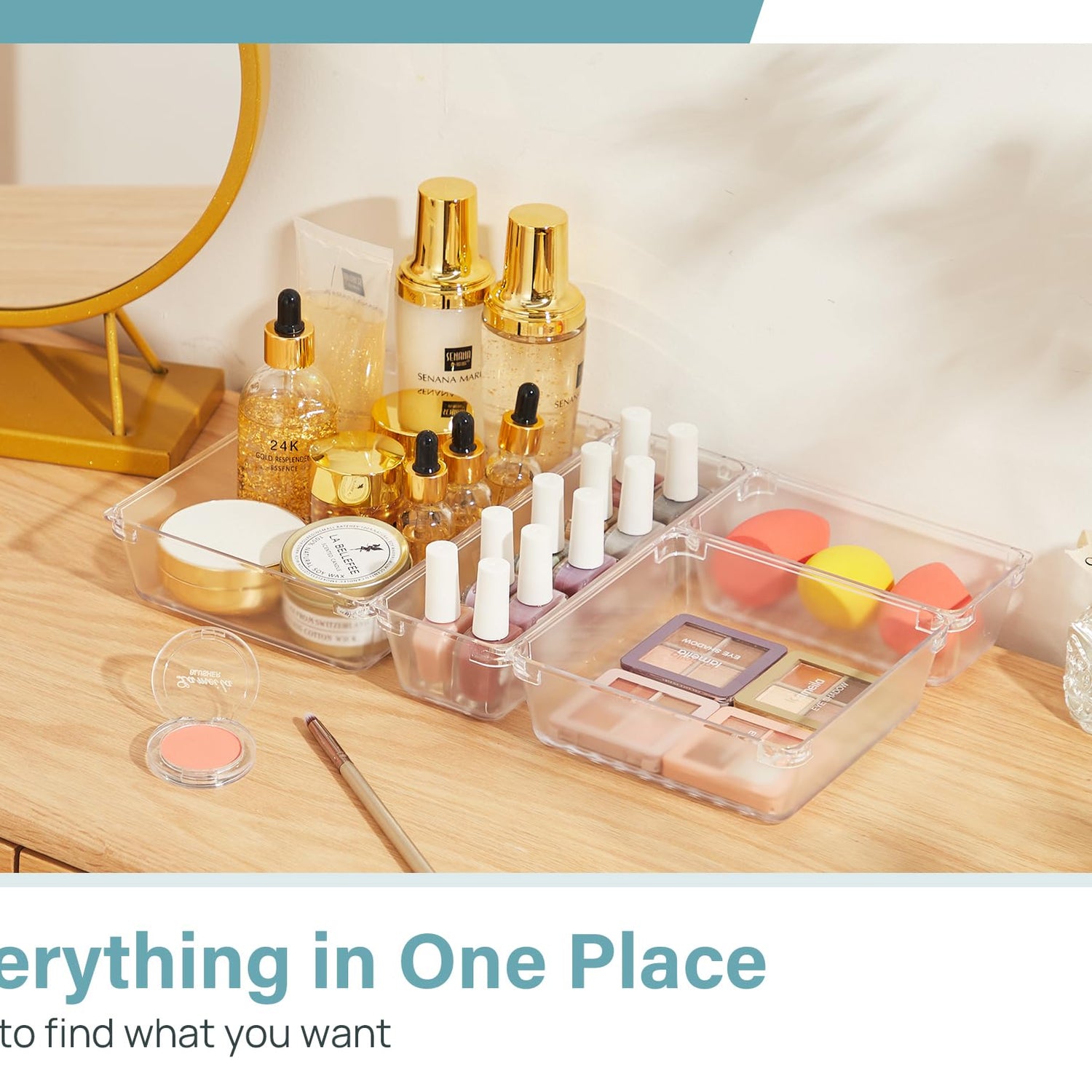 - Space-Saving Storage Solution: Our drawer organizers are designed to fit different drawers and maximize storage efficiency. Whether you need to organize jewelry, cosmetics, makeup tools, hair accessories, nail polish, toothpaste, hairbrushes, medicine, silverware, office supplies, or toiletries, these vanity organizers have got you covered.