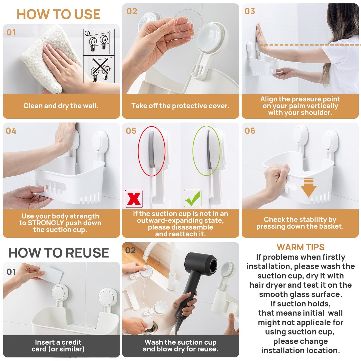 • One Second Installation: No drilling, no screws, no holes, no glue, no tools to apply the suction cup shower caddy. Simply choose a smooth and dry surface without any grout, take off the protective cover and push the board STRONGLY until you hear "PUFF", ONE second to complete the installation