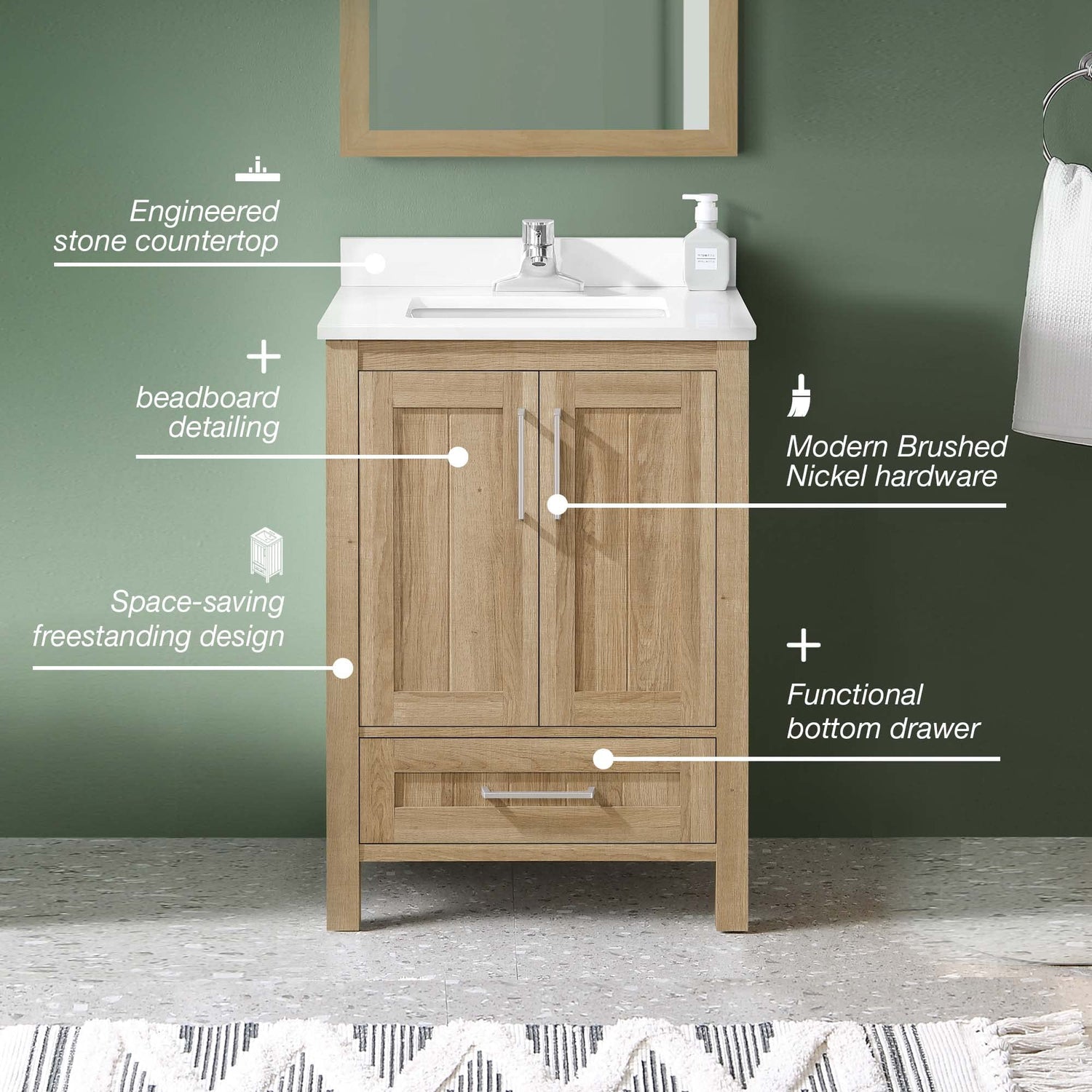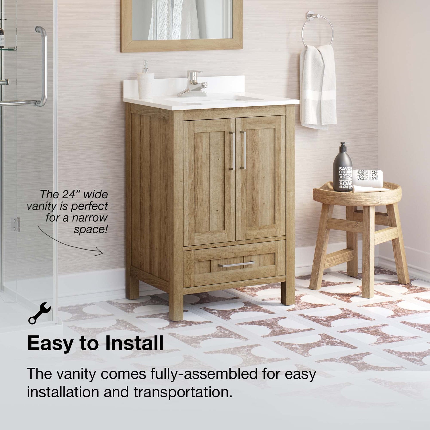 OVE Decors Kansas 24" Single Sink Bathroom Vanity Set with Countertop, Fully-Assembled | Ceramic Sink and Backsplash Included | 02 Doors, 01 Drawer, 24 inches, White Oak