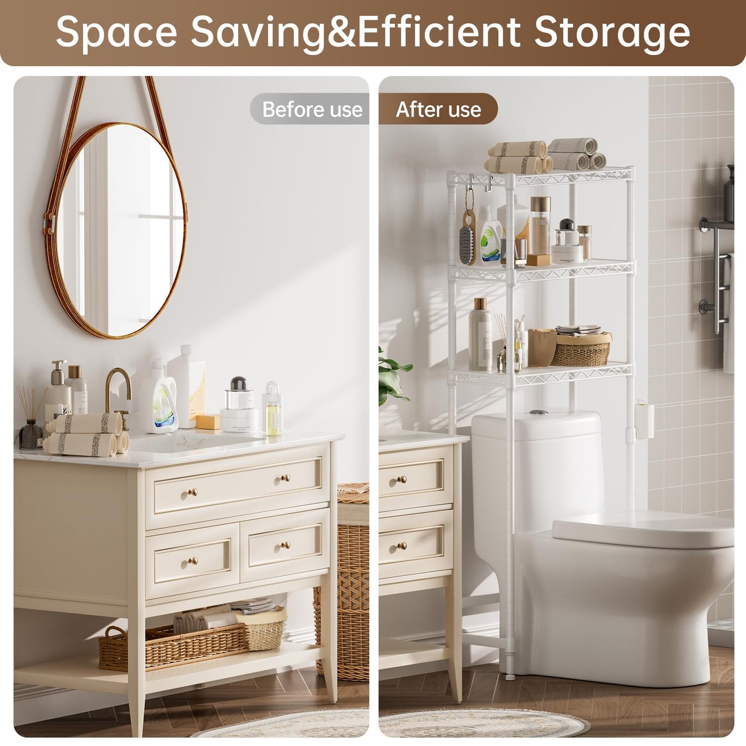 Over The Toilet Shelf,3-Tier Adjustable Freestanding Metal Bathroom Organizer Shelves with Toilet Paper Holder & Hooks,Space-Saving for Narrow Small Bathroom,10”D x 24”W x 66”H,White
