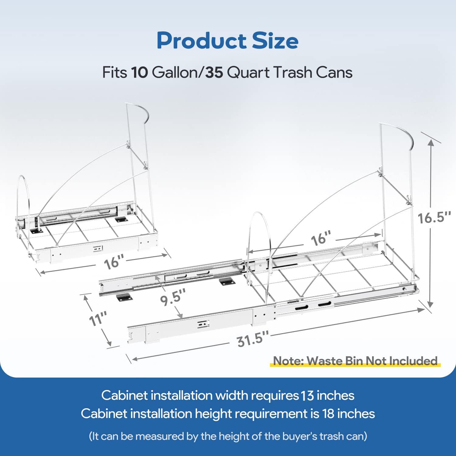 • 【Cabinet Requirements】Slide-Out Trash Can Rack Dimensions: 11in/28cm W x 16in/40.6cm D x 16.5in/42cm H; Minimum Cabinet Dimensions Required – 13in/33cm W x 18in/45.7cm D x 18in/45.7cm H. The pull-out cabinet system can hold up to 35 quarts of litter. If you have any questions, please feel free to contact us.