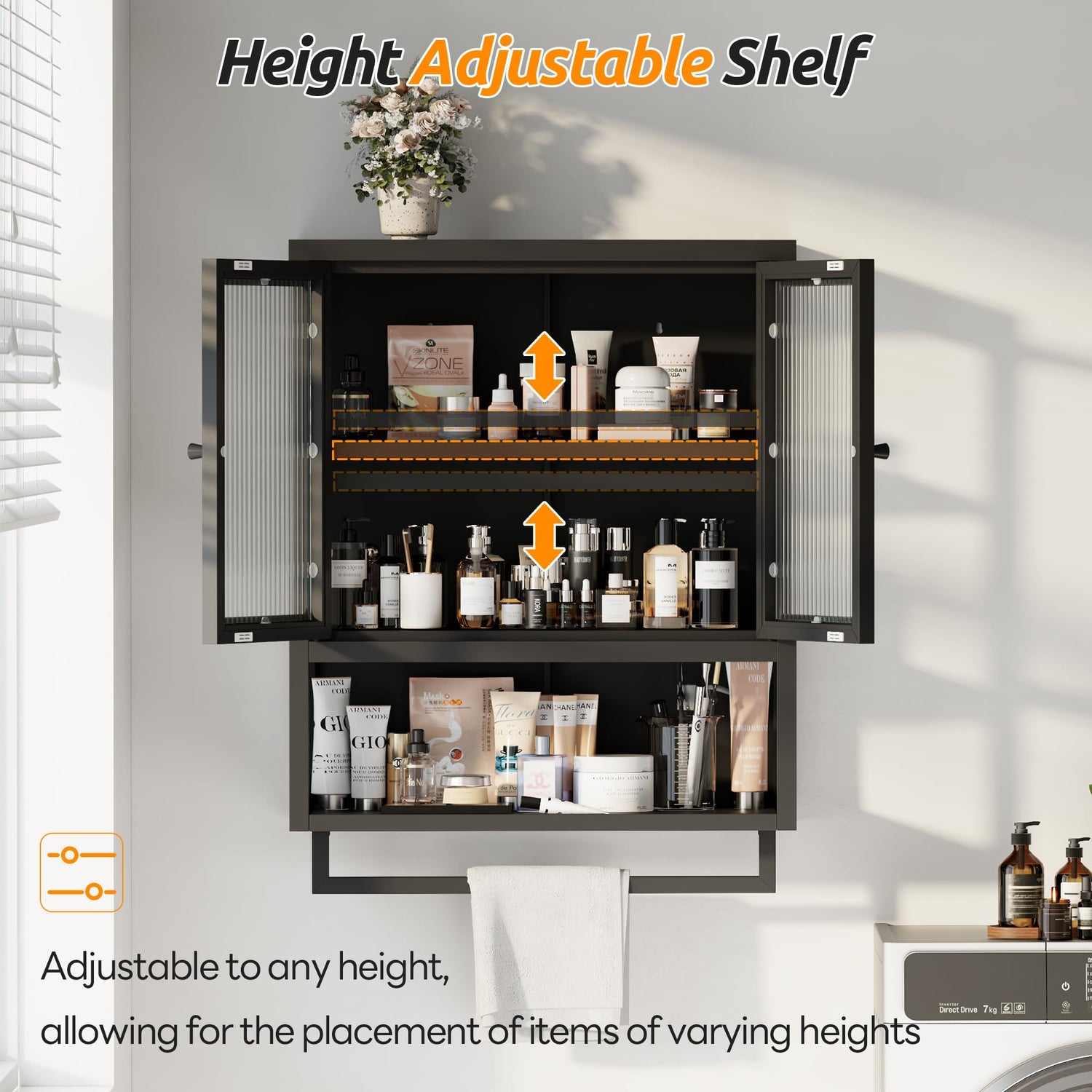 - Versatile Storage Space: Behind the two glass doors of the bathroom medicine cabinet, there is an adjustable shelf that can be set to any height, offering customizable storage space while keeping your items clean and dry. The open shelves are perfect for displaying decorative items. The medicine cabinet also comes with a towel bar, ideal for hanging towels, ties, belts, and more.