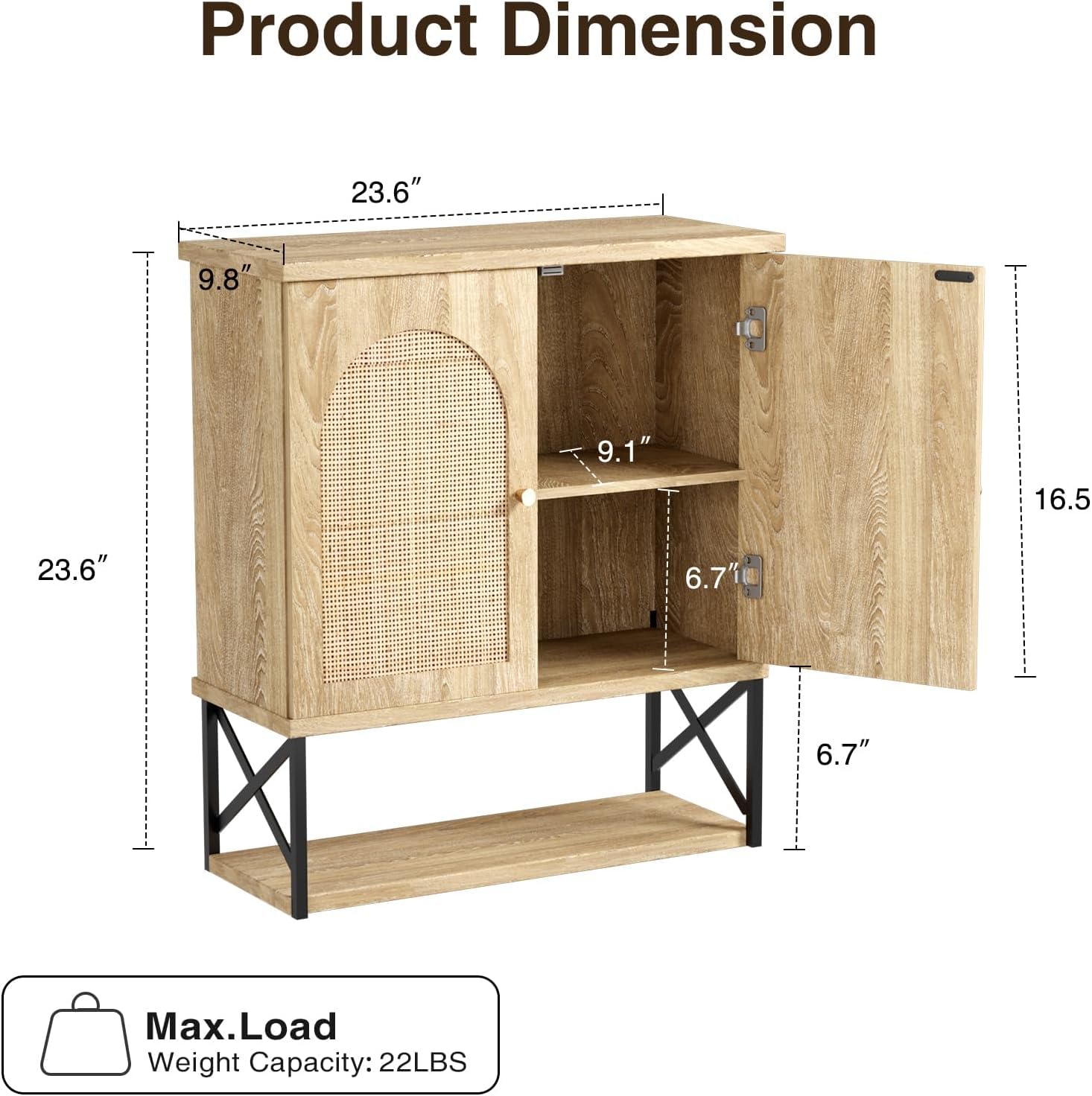- Elegant & Exquisite: Our wall mounted storage cabinet features an arched, handmade rattan door and an open shelf, suspended above the sink countertop. This exquisite bathroom wall cabinet showcases the charm of handmade rattan craftsmanship, wave wood grain and plant decoration complement each other. Bohemian style is full of unique cultural charm and natural beauty