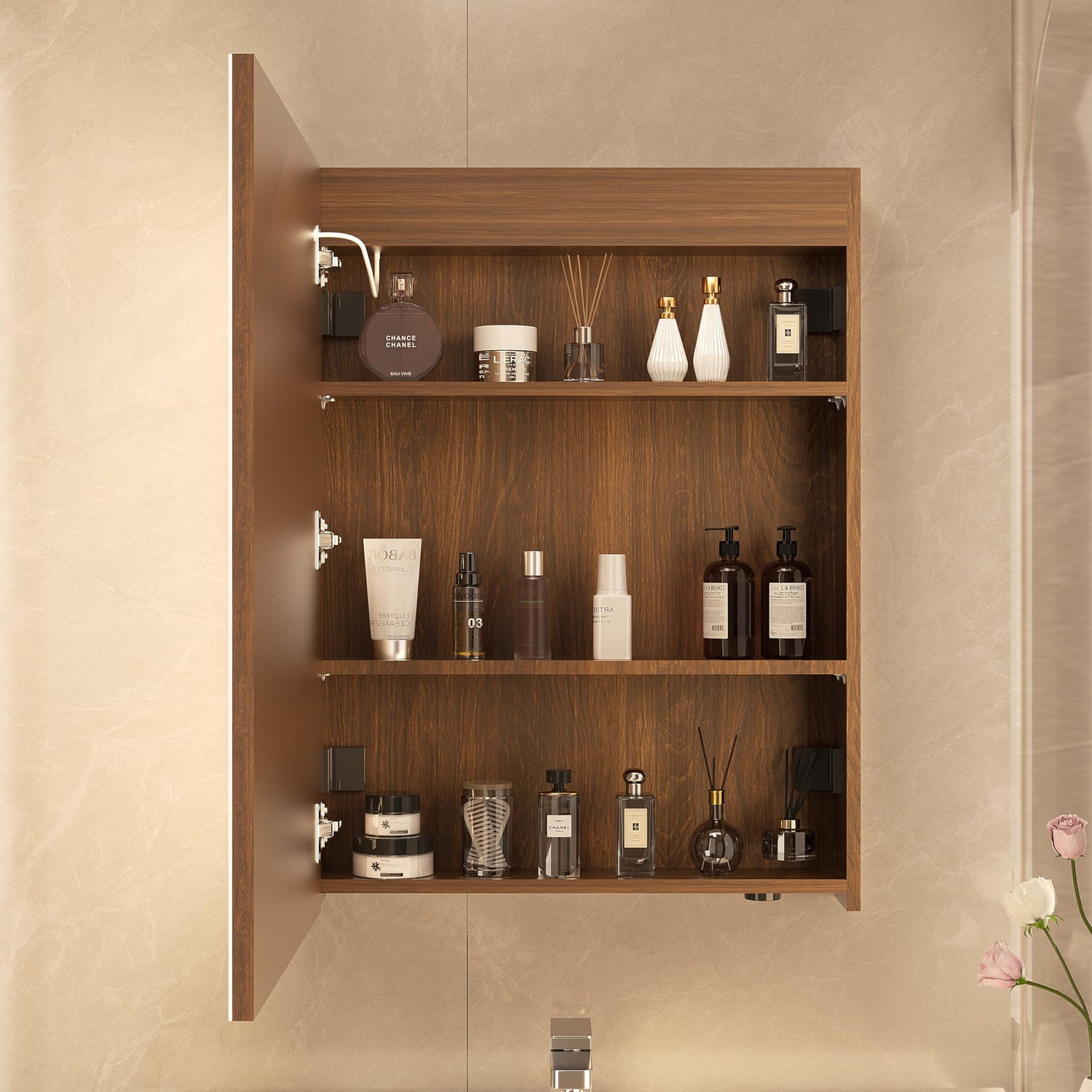 Réflexon 28x20 inch LED Lighted Medicine Cabinet with Mirror, Moisture-Resistant Wood, Stepless Dimmable, 3000K/5500K, Defogger, Adjustable Shelf, Flat-Pack Design – Assembly Required (Walnut)