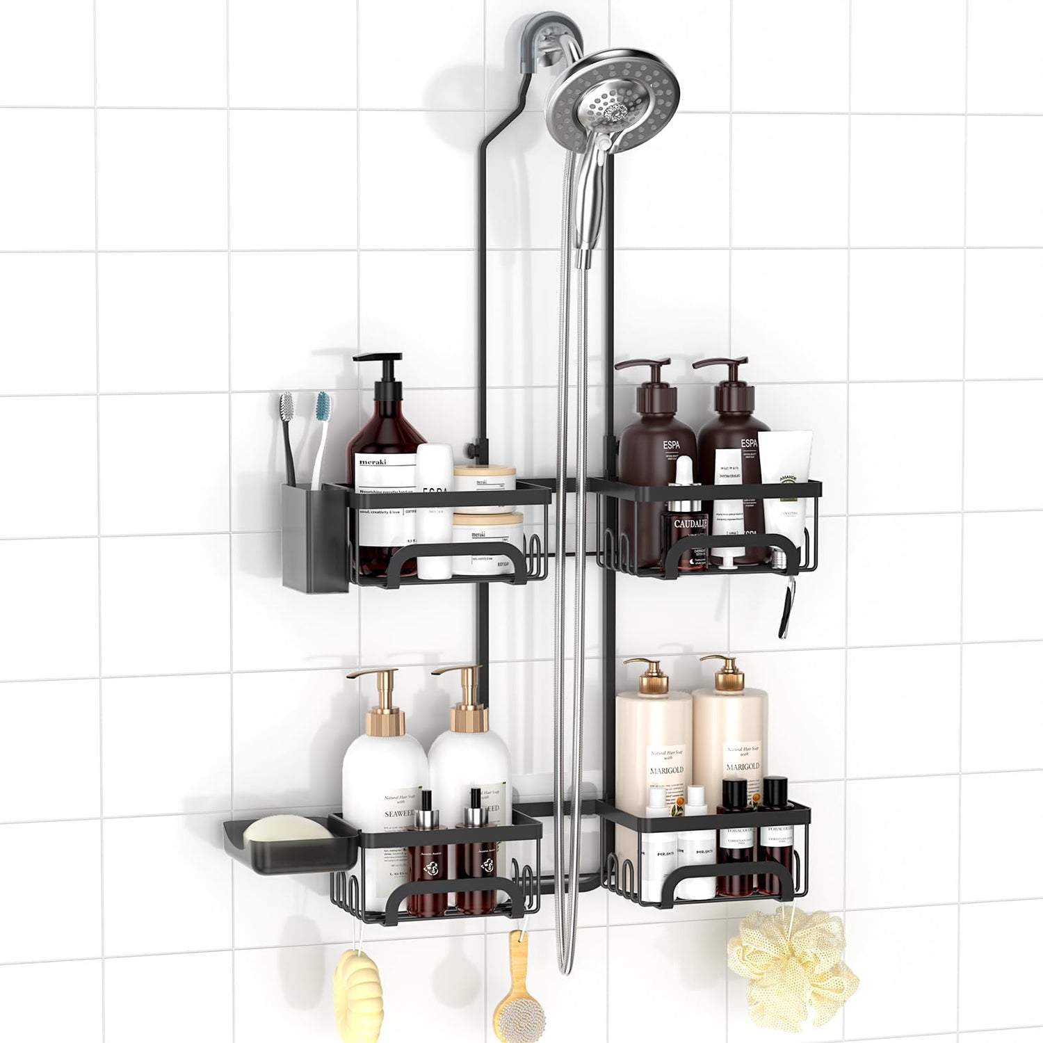 - 【EXPANDABLE STORAGE WITH RAZOR HOOKS】Added 16 side-mounted hooks for razors, loofahs, sponges, and towels. Spacious baskets of the shower caddy effortlessly organize all shampoos, conditioners, body wash, and other shower accessories within arm's reach. The shower organizer includes a dedicated soap holder and toothbrush holder for full organization.