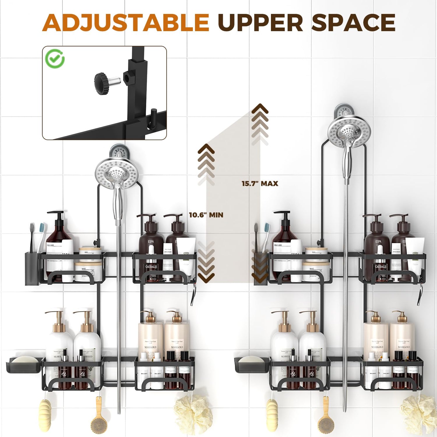 - 【TAILORED HEIGHT ADJUSTABILITY】Need flexibility? Easily customize how high or low the shower caddy hanging sits relative to the showerhead. Simply slide the top bracket up to make room for taller bottles or slide it down for a more compact fit. This adjustability (spanning from MIN 21.3'' to MAX 26.4'') makes the shower caddy ideal for most shower setup configurations.