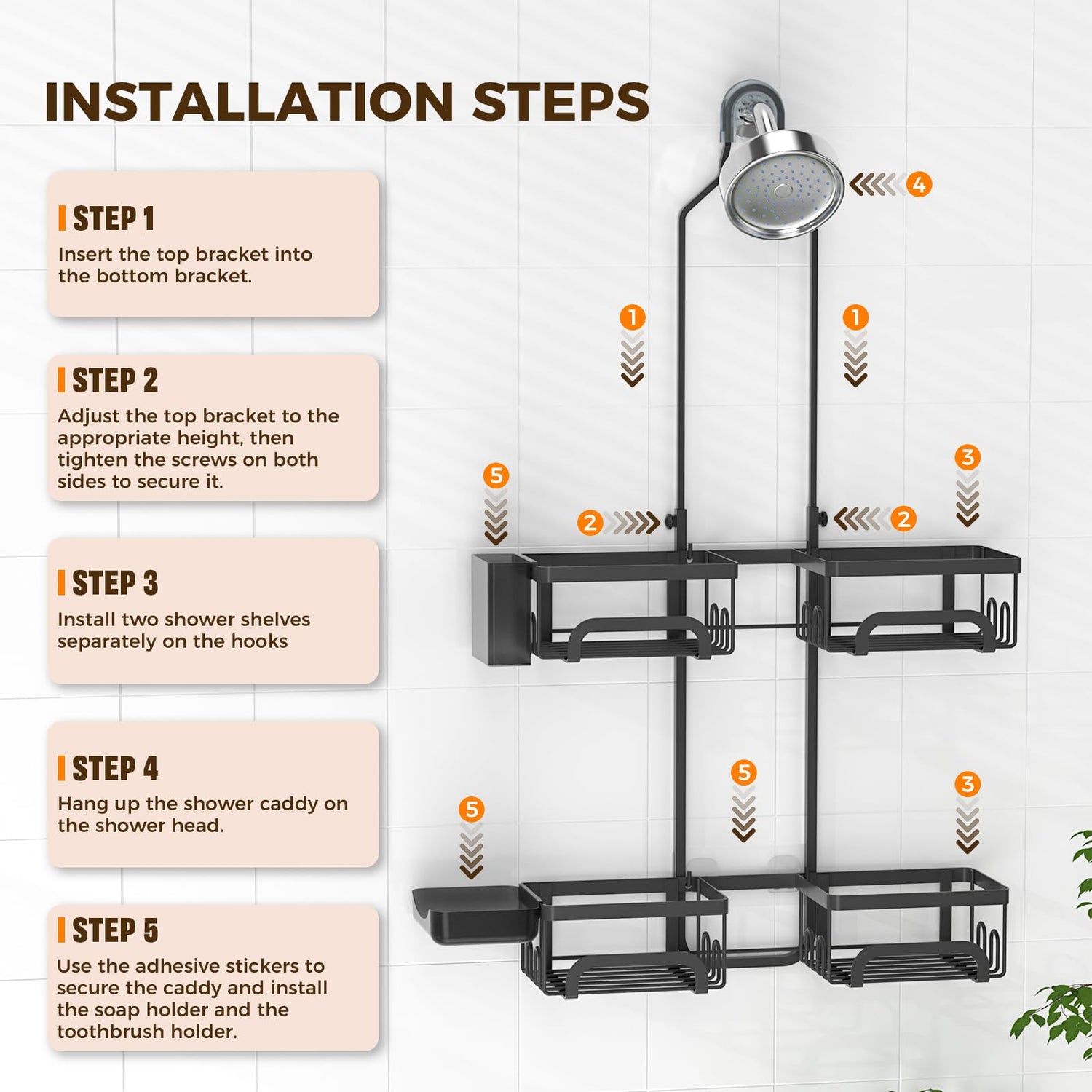 - 【ATTENTION】Please ensure that the screws on both sides of the shower caddy for adjusting the height are sufficiently tightened during installation, AS TIGHTLY AS POSSIBLE, to withstand the weight of bathing essentials, and prevent any parts of the shower caddy hanging from coming loose during use. The shower caddy comes with multiple parts to assemble.