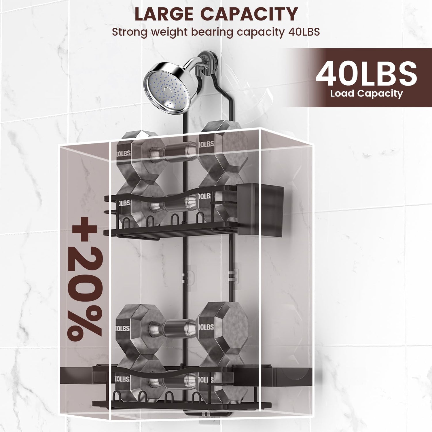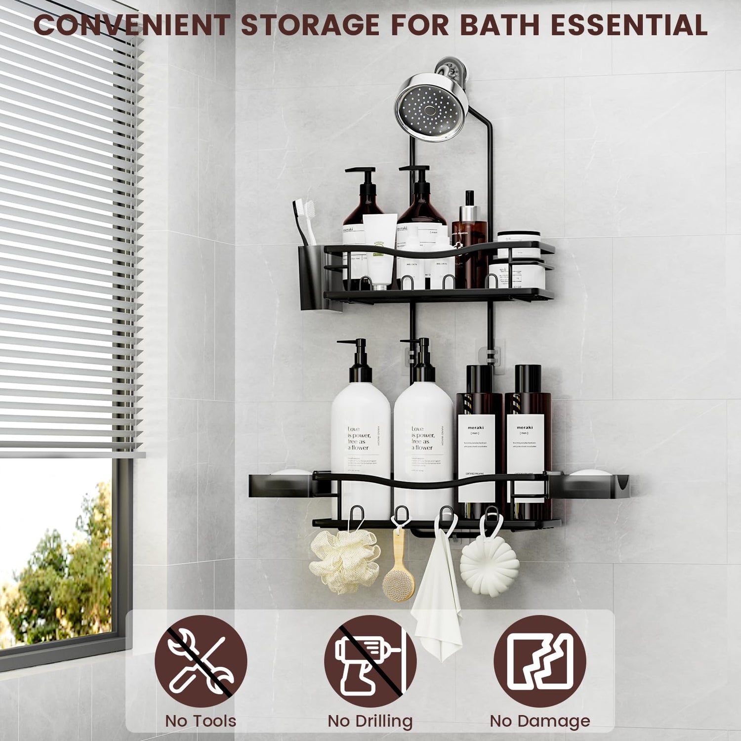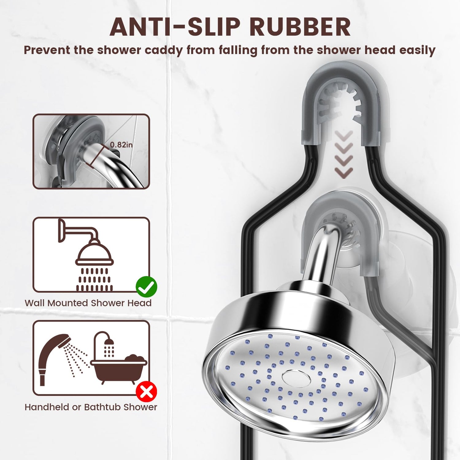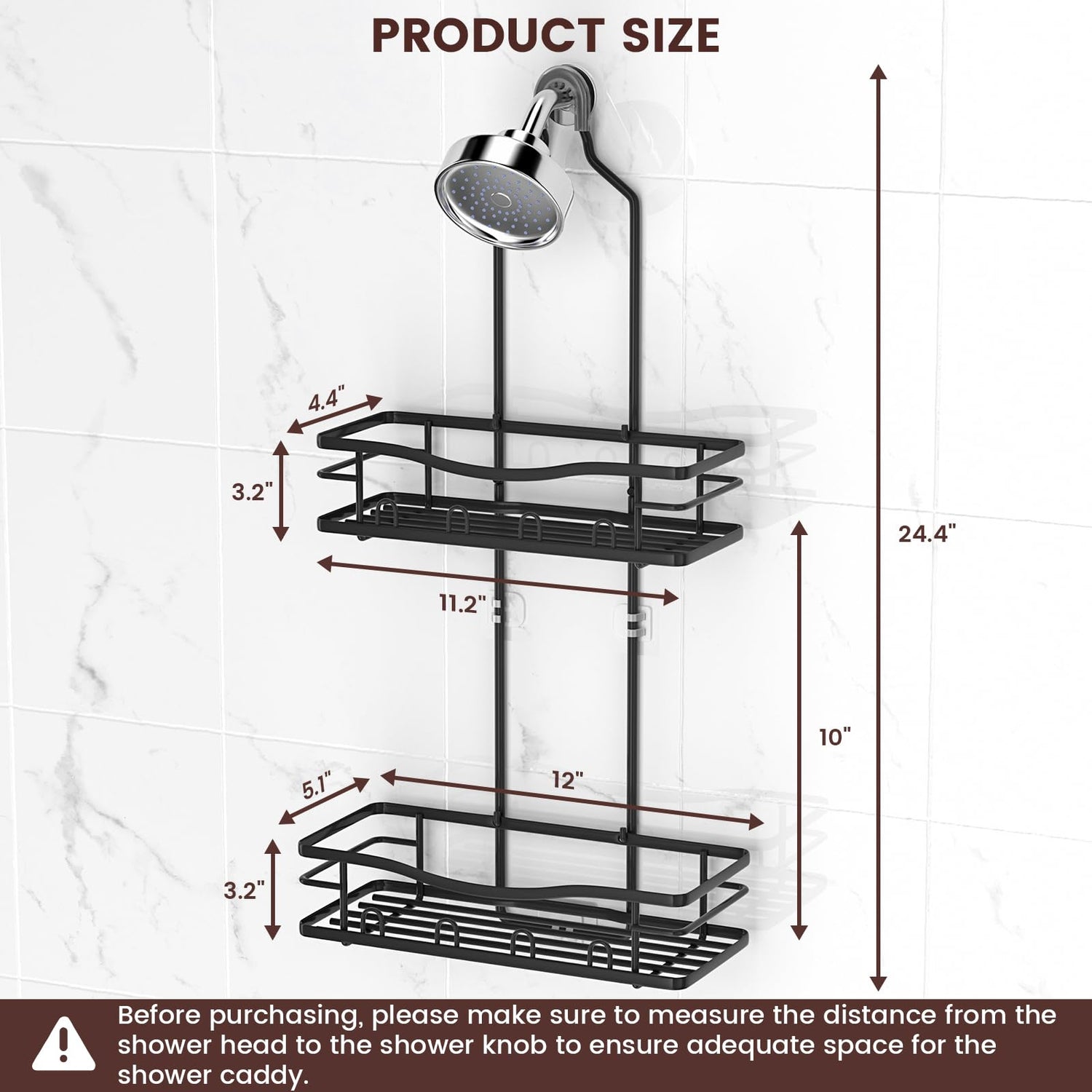 - 【RUSTPROOF & WATERPROOF - BUILT TO LAST IN HUMID BATHROOMS】Crafted from premium 304 stainless steel, the black shower caddy over shower head can resist rust and water damage. The durable design of the shower organizer hanging is perfect for the humid bathroom environment, making it long-lasting and highly reliable. Unlike plastic alternatives, the stainless steel material ensures that the shower organizer maintains its integrity and appearance over time, even with frequent exposure to water and steam.