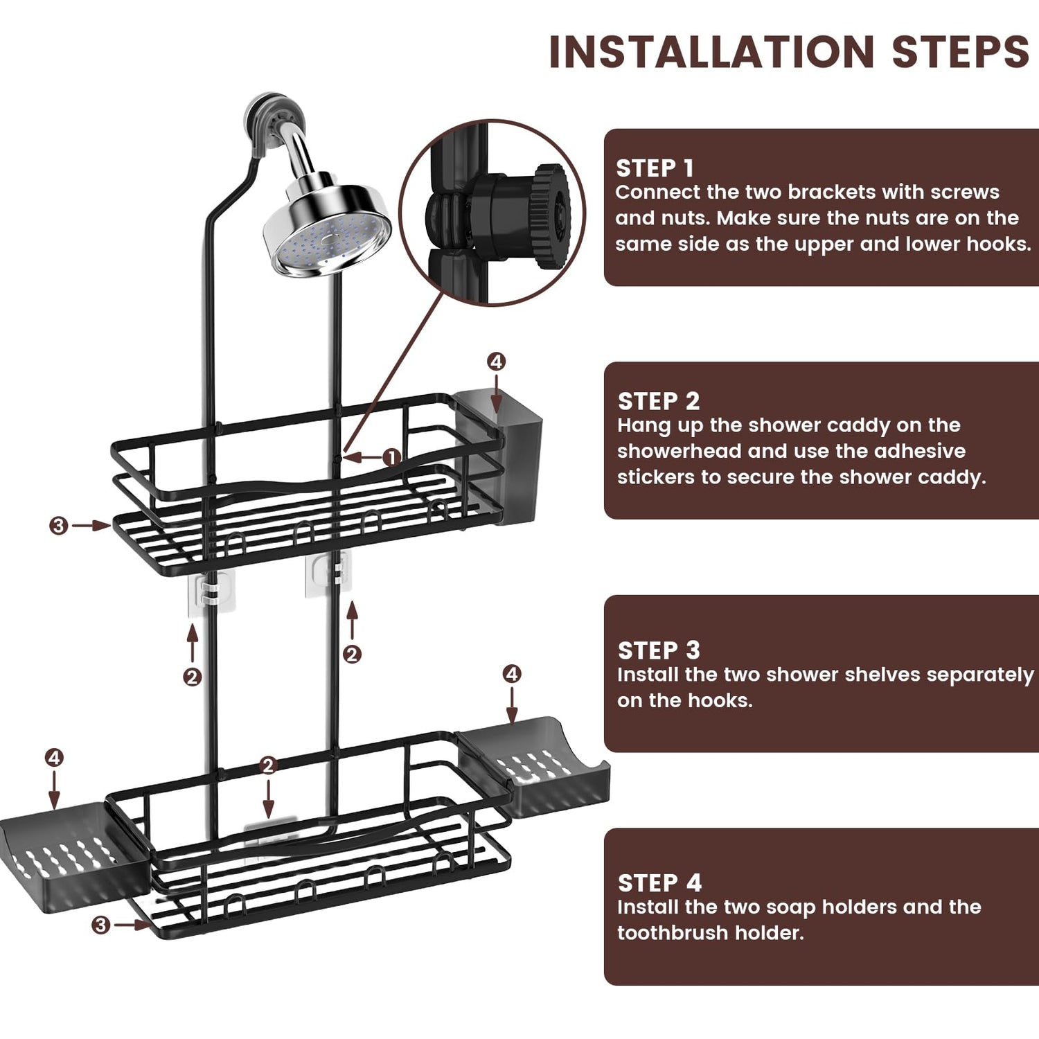 - 【NO-DRILL INSTALLATION - SETUP IN 1 MINUTE】Installing the shower caddy hanging without any tools and drilling. Just connect two brackets together, install baskets, and then hang the black shower caddy on standard 21mm shower arms (which works with most showerheads), and the rubber-lined top grip keeps the shower organizer steady. If your walls are smooth, use the included adhesive strips for extra support—no drilling or tools needed.