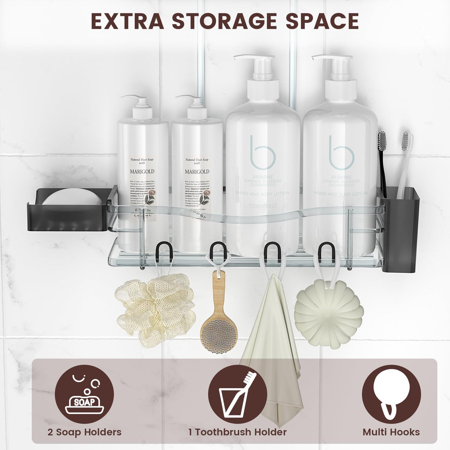 - 【LARGE CAPACITY FOR MOST BATH ESSENTIALS】The thoughtfully designed black shower caddy hanging offers ample space to organize all your shower essentials. With two large baskets, the shower organizer can easily accommodate shampoo, conditioner, body wash, and other shower bottles. In addition, the hanging shower caddy includes two soap holders and a toothbrush holder to keep your bathroom tidy. Multiple hooks are also included, providing extra storage for loofahs, razors, or other small items, ensuring your shower area stays neat and clutter-free.