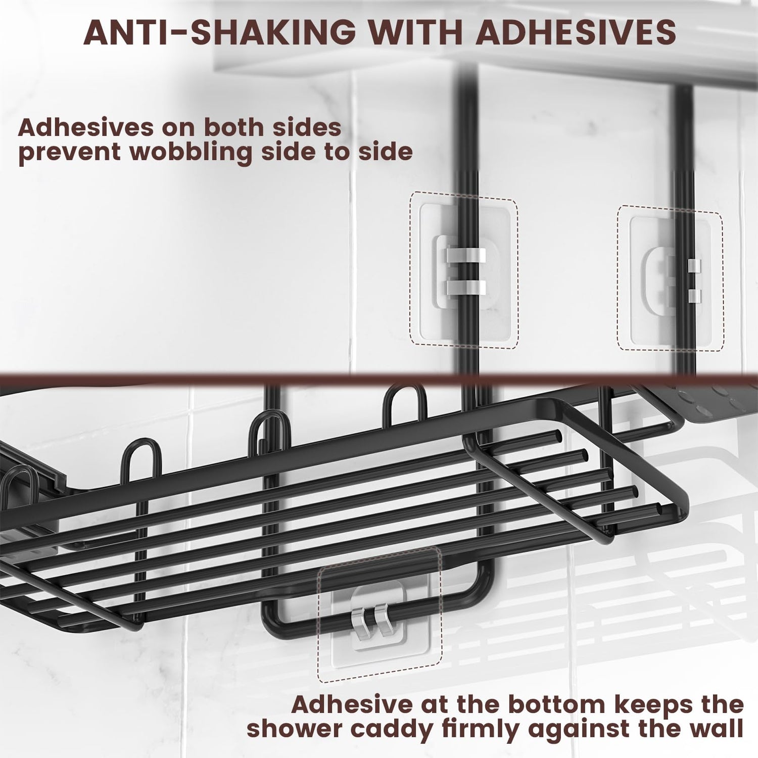 - 【ANTI-SLIP & WOBBLE-PROOF - STABILITY YOU CAN TRUST】One of the standout features of the black shower caddy is its stability. Even when filled with bottles, the shower caddy hanging remains firmly in place without slipping, tipping, or wobbling. The included adhesive stickers provide an additional layer of stability, allowing you to further stabilize the hanging shower organizer against the shower wall. This ensures that your shower essentials and shower organizer hanging stay in place.
