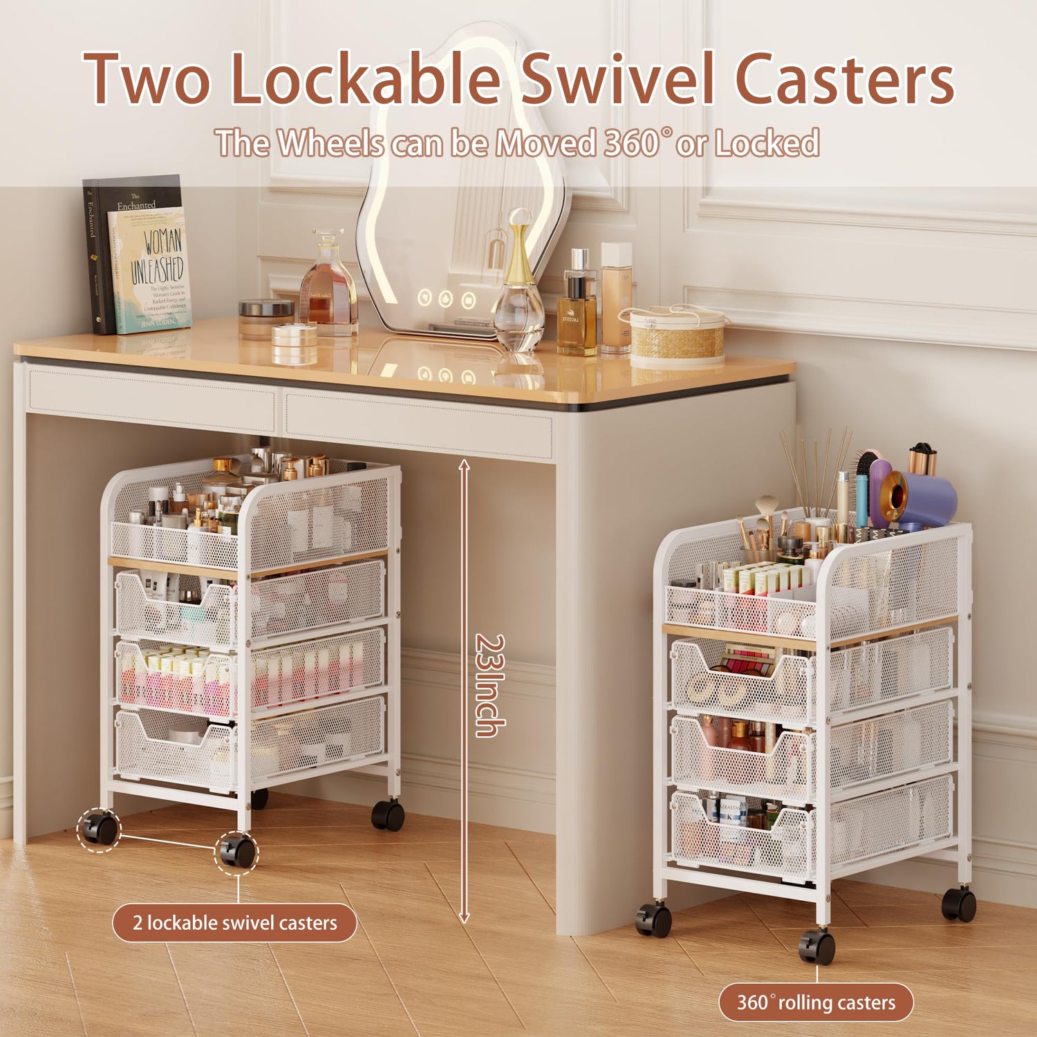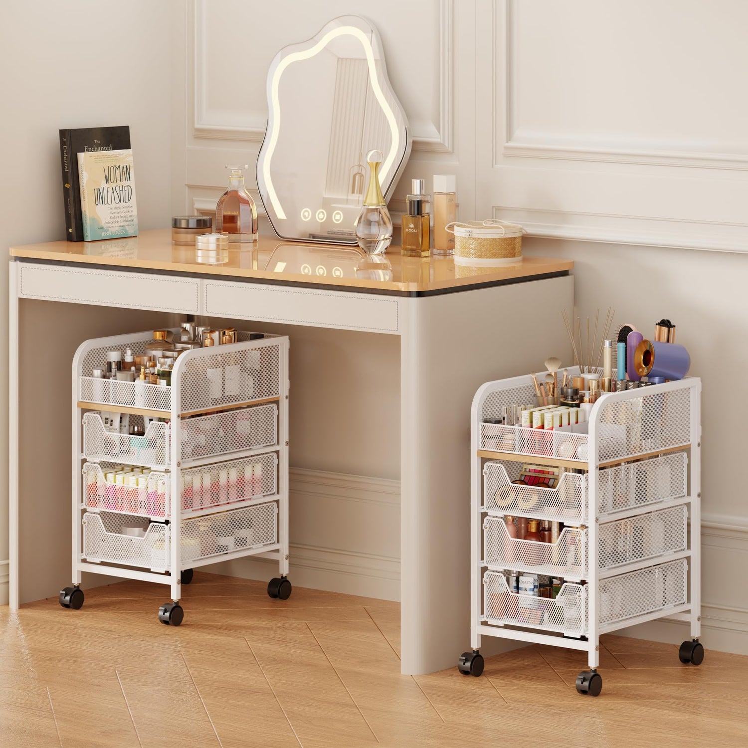 - 【Three Drawers for Organized Storage】 Featuring three spacious mesh drawers, this rolling storage cart with drawers is perfect for categorizing your makeup, skincare, and beauty accessories. It provides ample space for better organization, ensuring your vanity remains clutter-free. Whether used as a Makeup Organizer or Vanity Organizer, it offers a sleek and practical storage solution for any room.