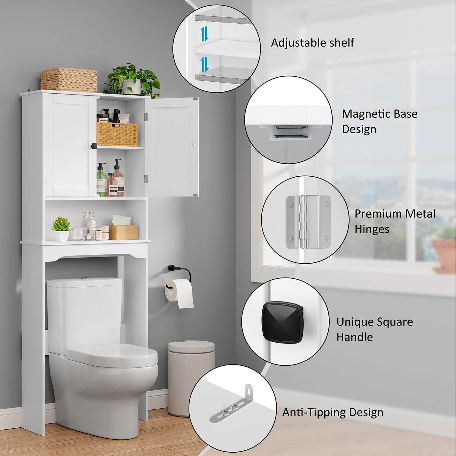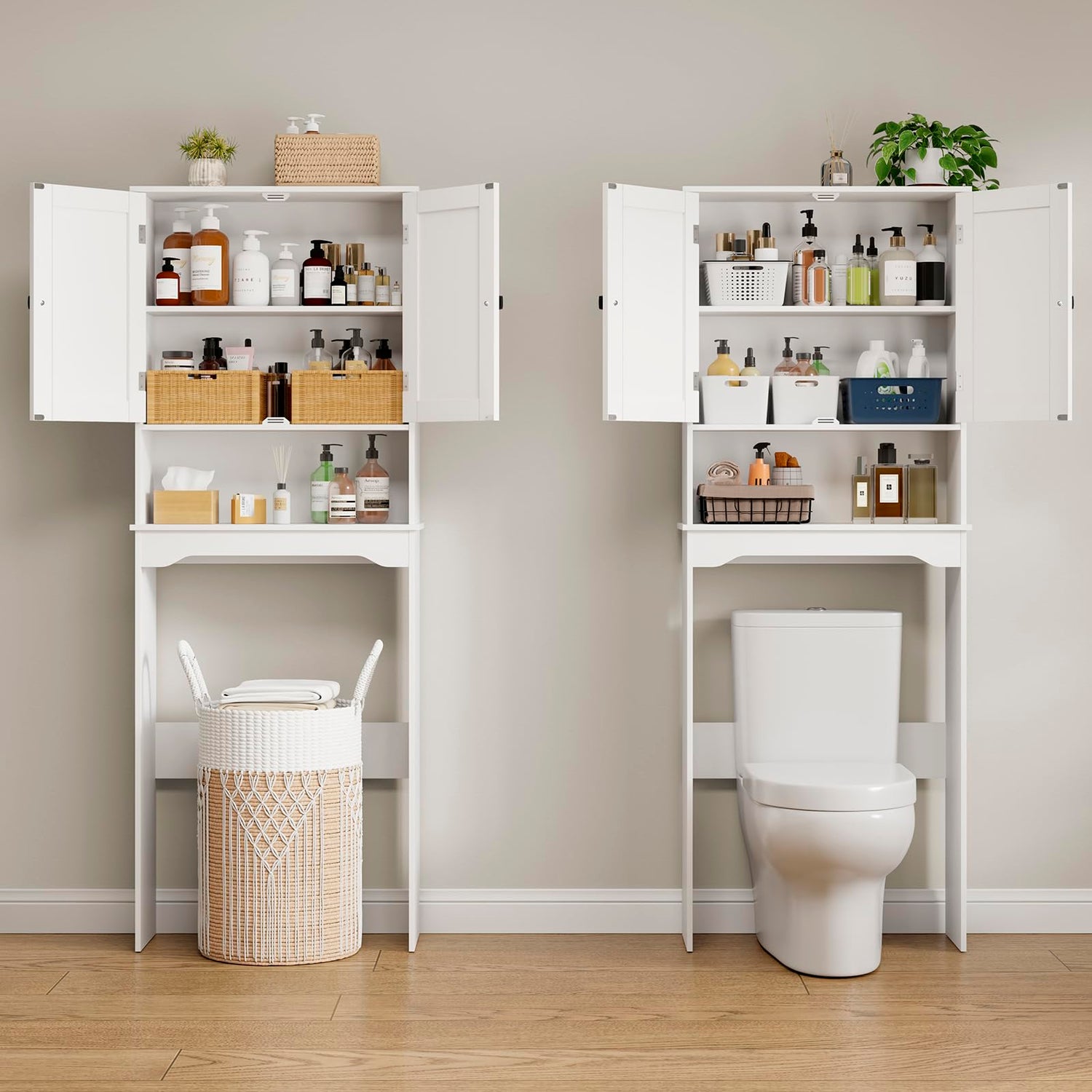 RRX Over The Toilet Storage Cabinet,Bathroom Above Toilet Cabinets Organizer, 24.8" L x 9.1 "W x 65.7 "H Free Standing Toilet Rack with Adjustable Shelf and Open Storage,Double Doors, White