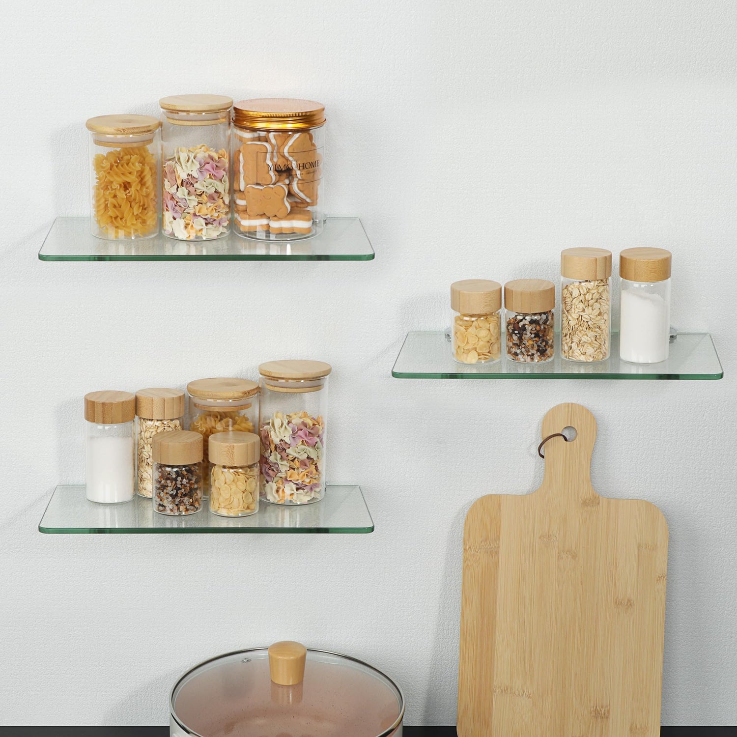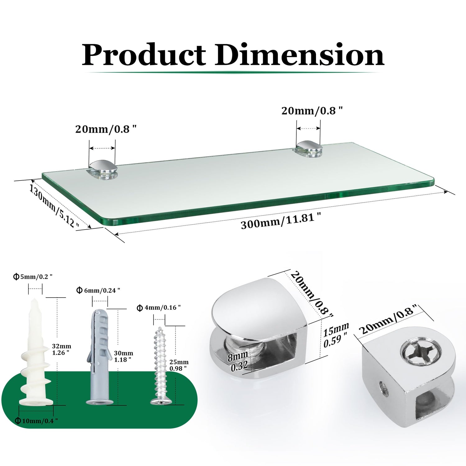 - THREE-LAYER STRUCTURE FOR SPACE SAVING - The overall dimension of each floating shelf for wall is 11.81”W X5.12”D, allowing you to efficiently utilize space on wall. The thickness of the tempered glass is 0.24 inches, and the heigth of the bracket is 0.59 inches.