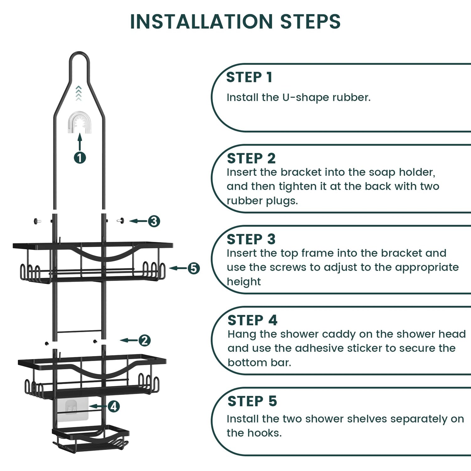 • 【ATTENTION】Please ensure that the screws on both sides of the shower caddy for adjusting the height are sufficiently tightened during installation, AS TIGHT AS POSSIBLE, to withstand the weight of bathing essentials, and prevent any parts of the shower caddy hanging from coming loose during use. ONLY SUITABLE FOR WALL-MOUNTED SHOWER HEAD.