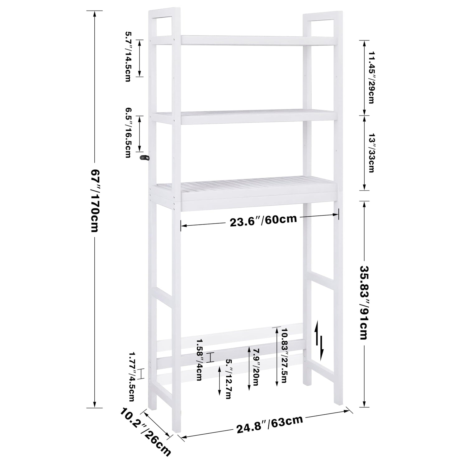- FIT MOST STANDARD TOILETS: Product dimension: 24.8”L X 10.2”W X 67”H (63x26x170cm). The toilet clearance of this Multipurpose storage organizer is 37.42” (95cm) from ground, suit for most standard size of toilets, perfect use in bath, laundry room, balcony
