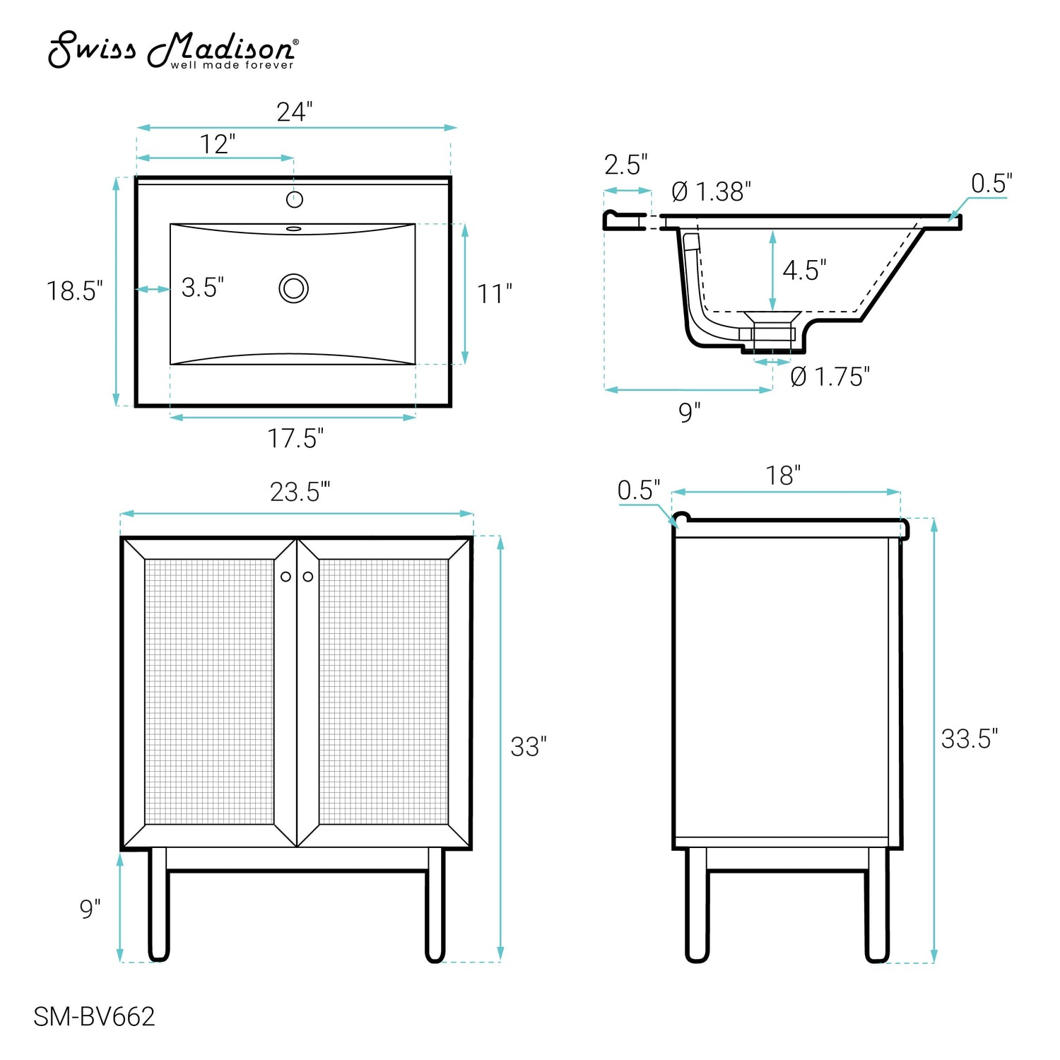 Details: The Classé Bathroom Vanity has a sleek, mid century look designed to elevate any bathroom setting. This vanity's compact design features two soft, slow closing doors for ease-of-use and to help maximize storage space. This sturdy and easy-to-install design complements a multitude of bathrooms and can be paired with any Swiss Madison Faucet.