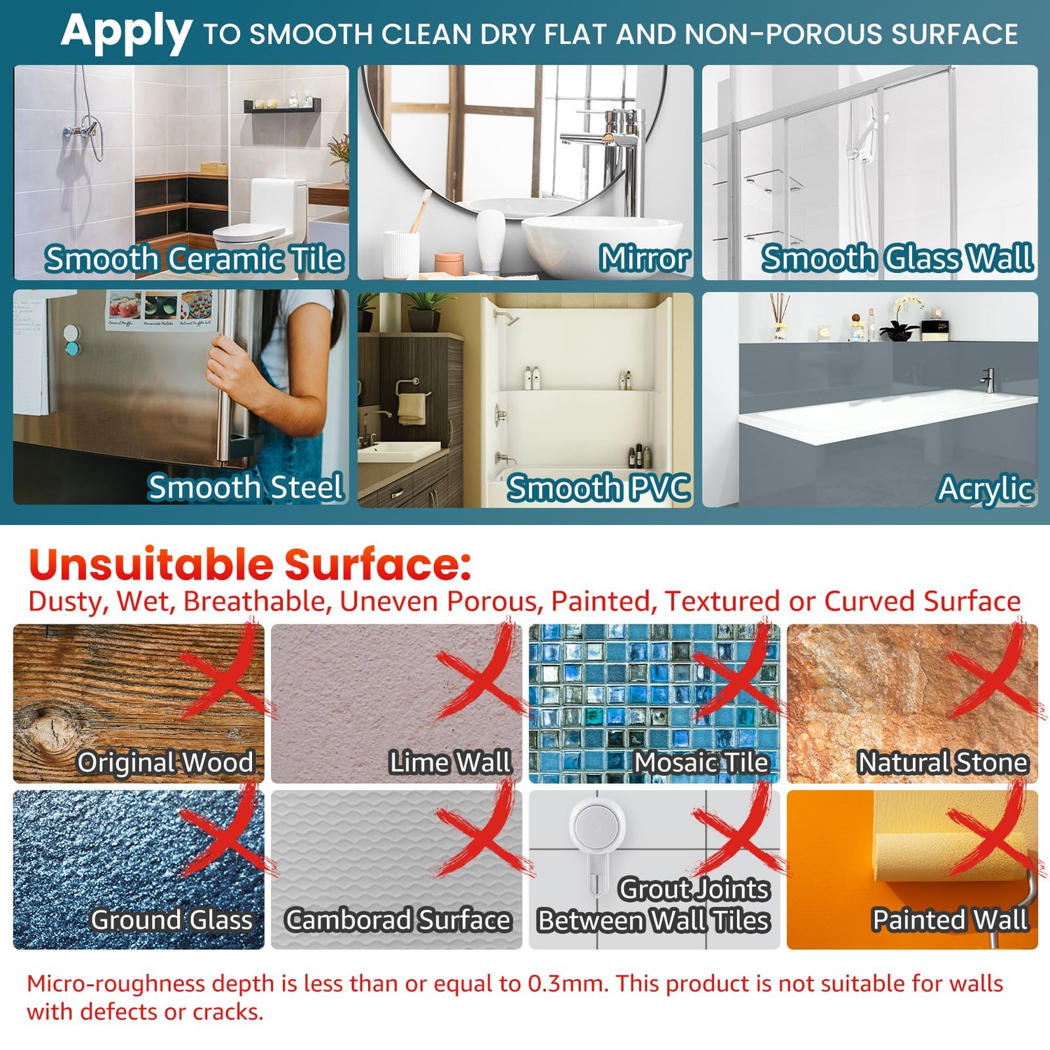 • Warm Tips: The suction cups only stick on smooth, non-porous surfaces like metal, glass, tile, stainless steel and acrylic but not apply to uneven tiles, texture plate, unfinished marble, wallpaper, painted wall, etc. If problems when firstly installation, please wash the suction cup, dry it with hair dryer and test it on the smooth glass surface. If suction holds, that means initial wall might not applicable for using suction cup, please change installation location
