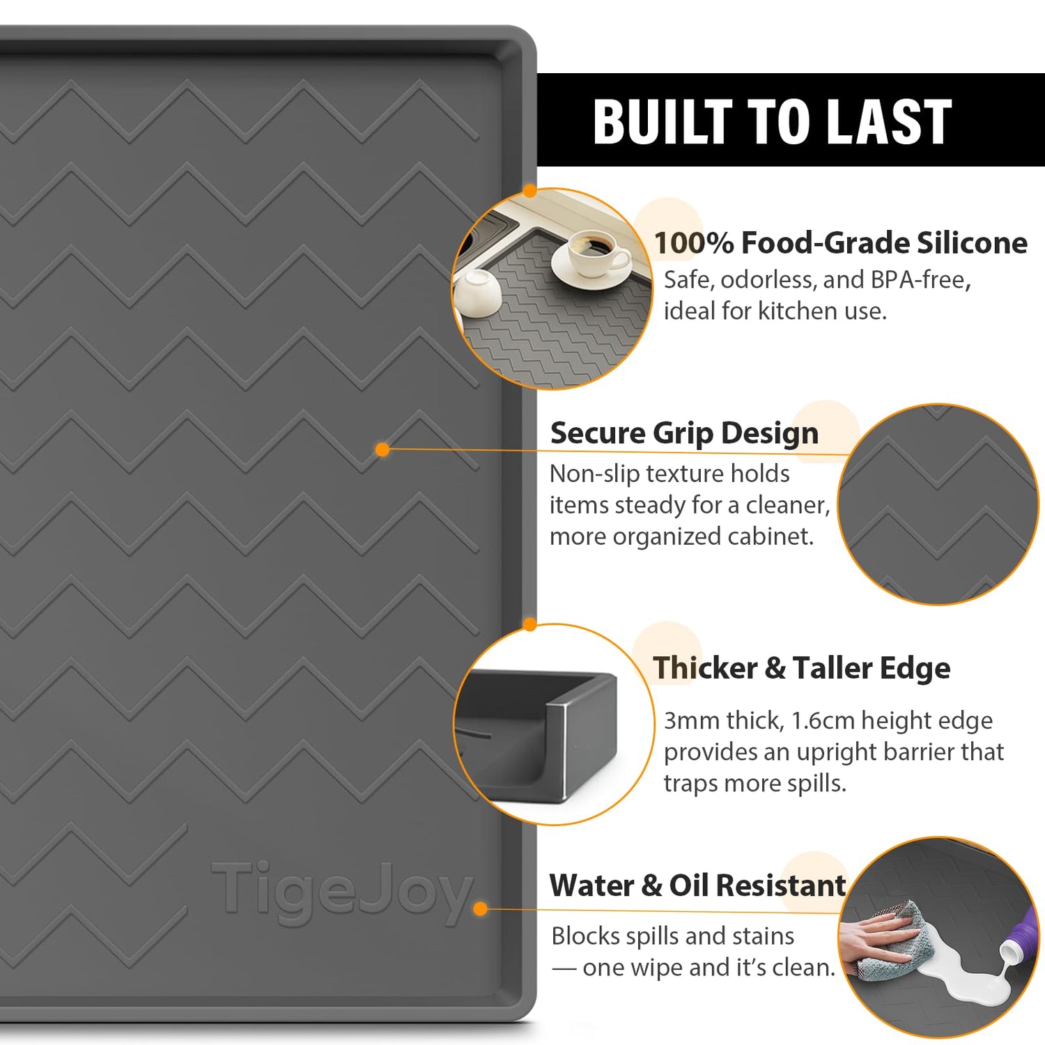- Upgraded Protection: Built with extra-thick food-grade silicone, our under sink mat offers premium leak protection without the premium price. Designed to hold up to 3.3 gallons of liquid, it shields cabinets from plumbing leaks, chemical spills, and daily mess.