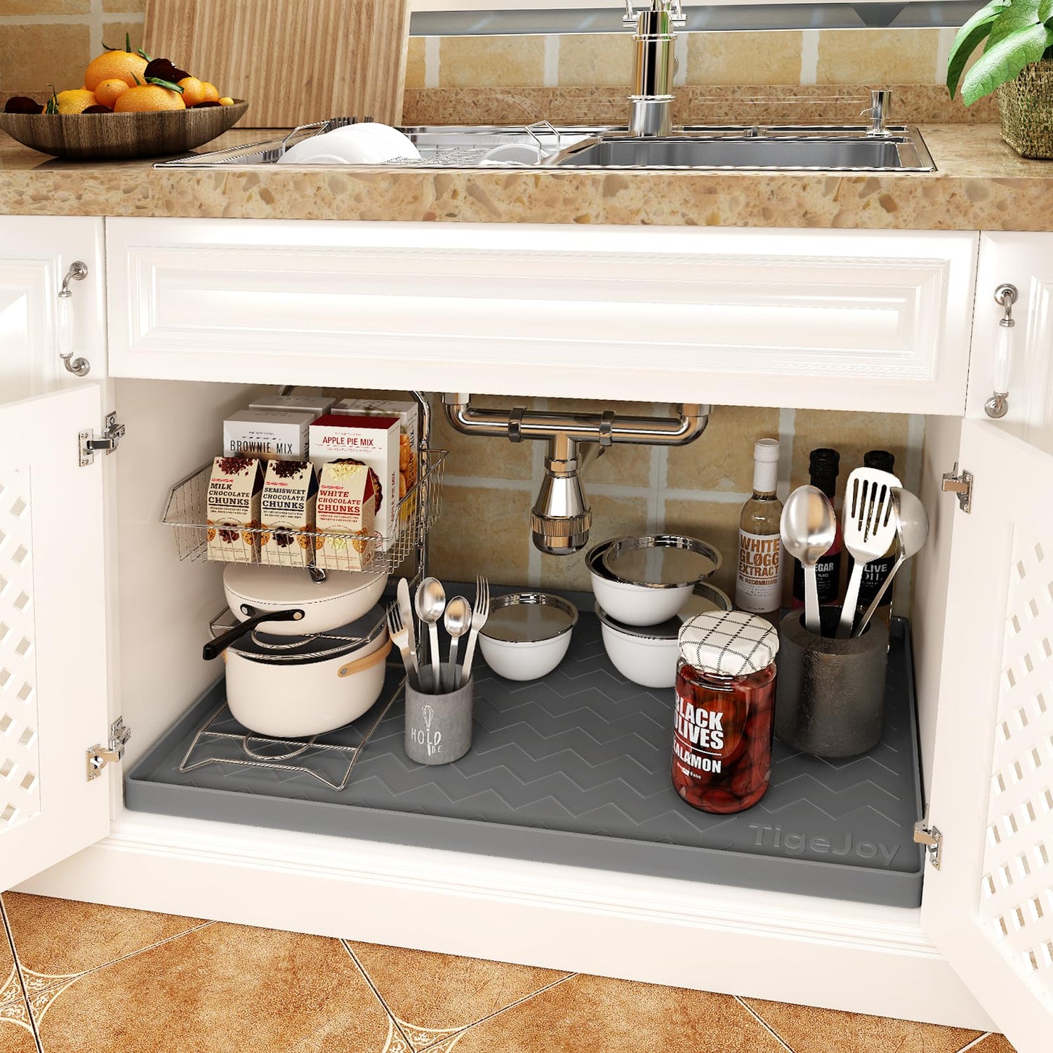 TigeJoy Under Sink Mat for Kitchen Cabinet 34" x 22", Upgraded Thick Silicone Waterproof Protector with Raised Edge, Anti-Leak Shelf Liner for Bathroom Tray Sink Organizers and Storage