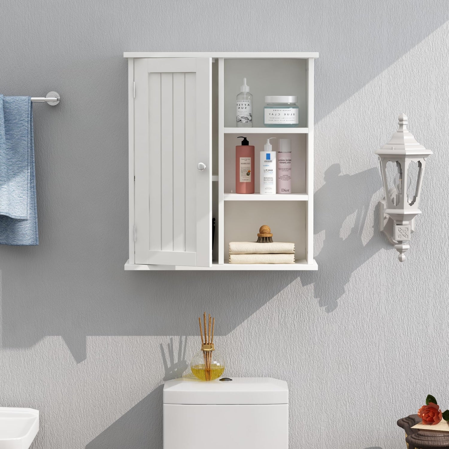 Treocho Bathroom Wall Cabinet, Medicine Cabinet with Door and 3 Open Shelves, Wall Mounted Storage Organizer for Bathroom, Kitchen, Living Room, White