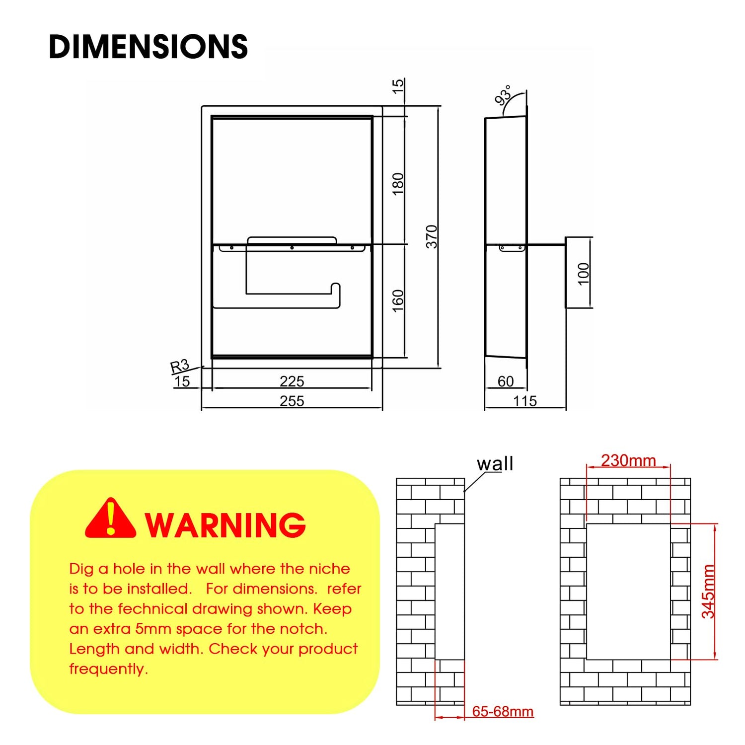 - 【Dimensions】Place the recessed toilet paper holder niche into the 9in*13.5in*2.6in (length*width*height) hole reserved on the wall, and fix the edges with silicone adhesive. The rimless stainless in wall niche is flush-mounted with tiles around.