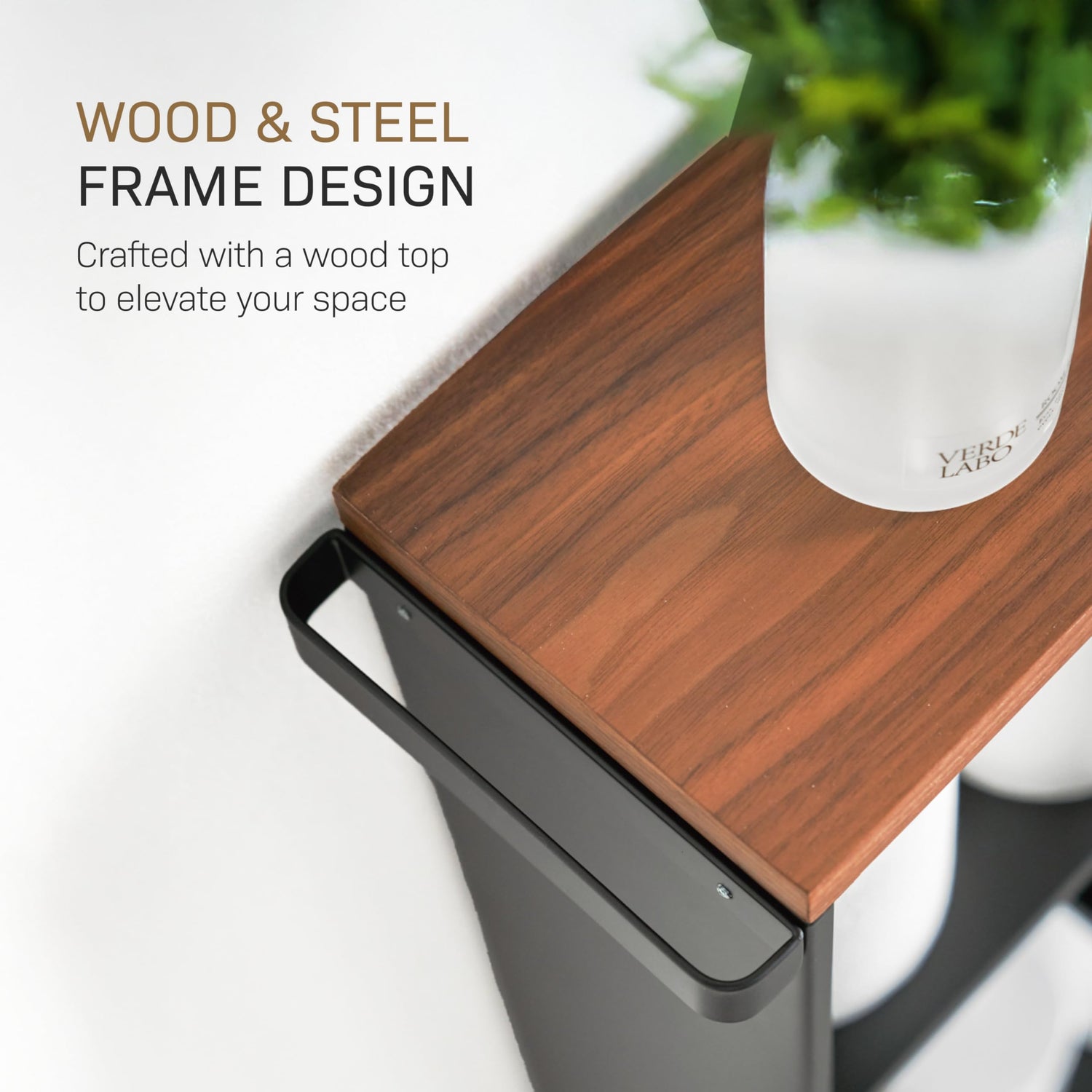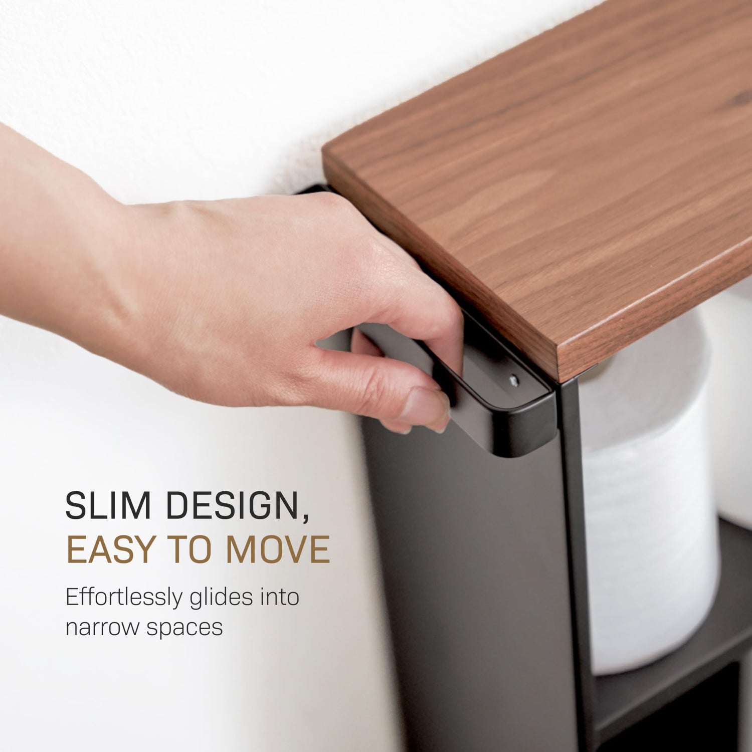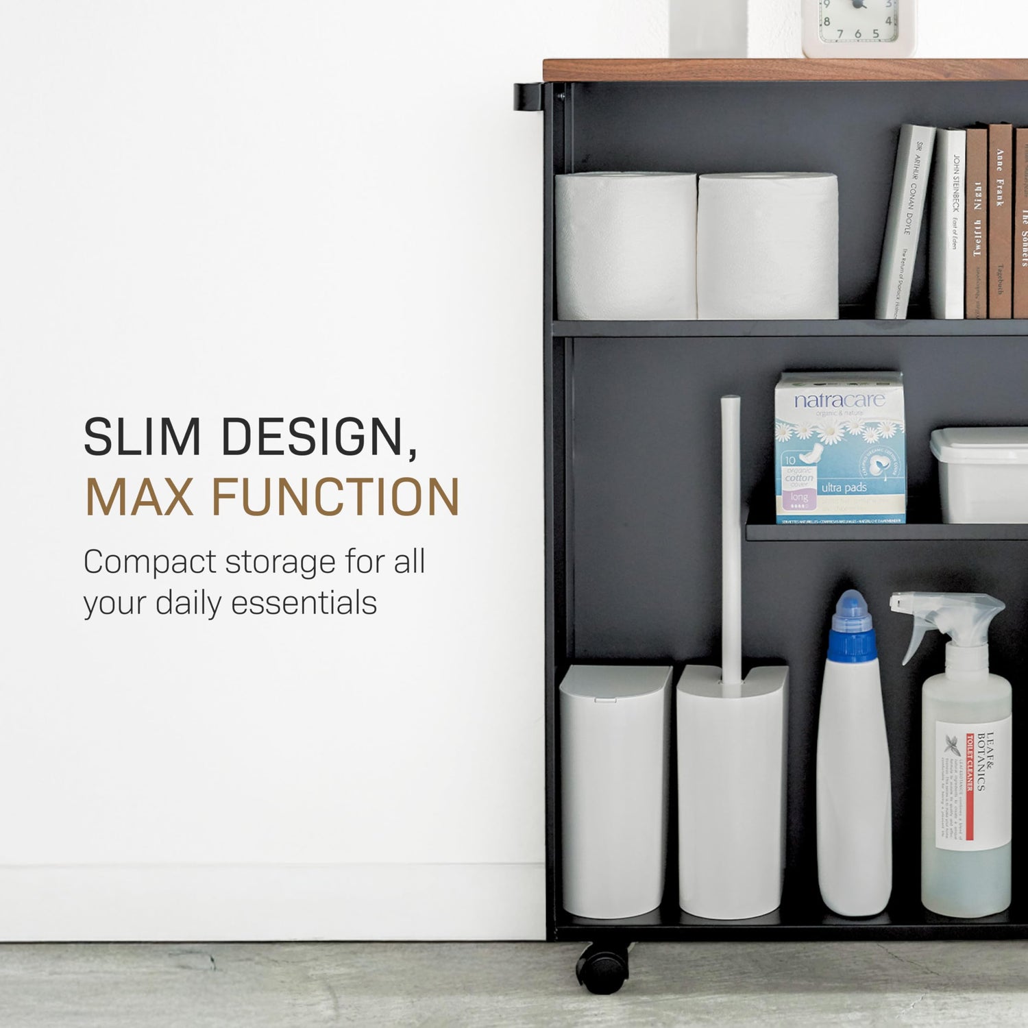 Inspired by life in Japan, the cart features a slender steel frame, a refined wooden top, and three cleverly designed shelves to hold everything from toiletries to tall cleaning bottles. The reversible handle and smooth-rolling casters make it easy to maneuver, while the discreet side panel keeps clutter hidden from view.