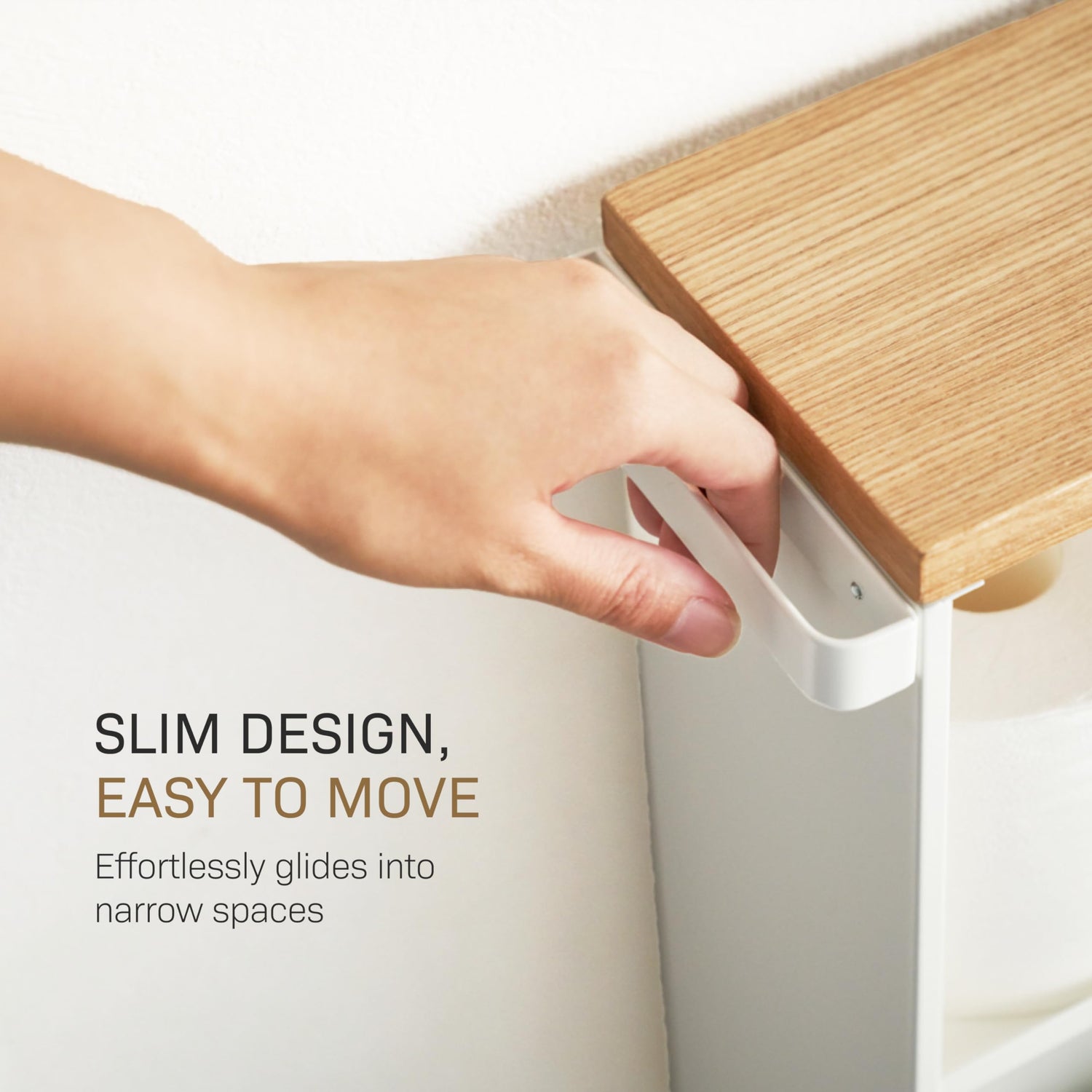 YAMAZAKI Home Slim Rolling Storage Cart – Narrow Bathroom Storage Cabinet with Handle, Slim Bathroom Storage Cart with Wheels, Easy Assembly, Steel + Wood, White
