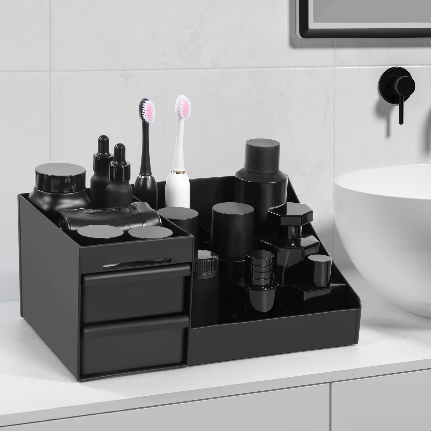 - 【SUPER CAPACITY】The bathroom organizer countertop has 7 spacious compartments and 2 ultra-deep drawers,which can store all kinds of articles and can be used as storage equipment for bathrooms, bedrooms, offices and kitchens.
