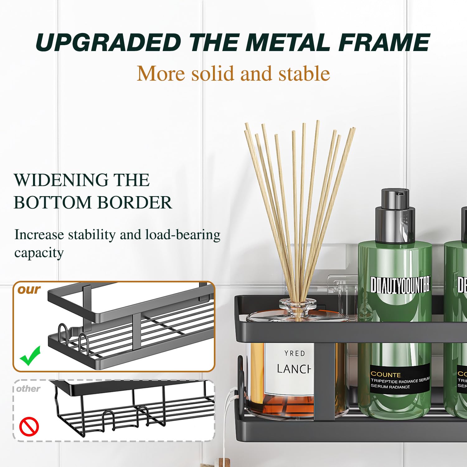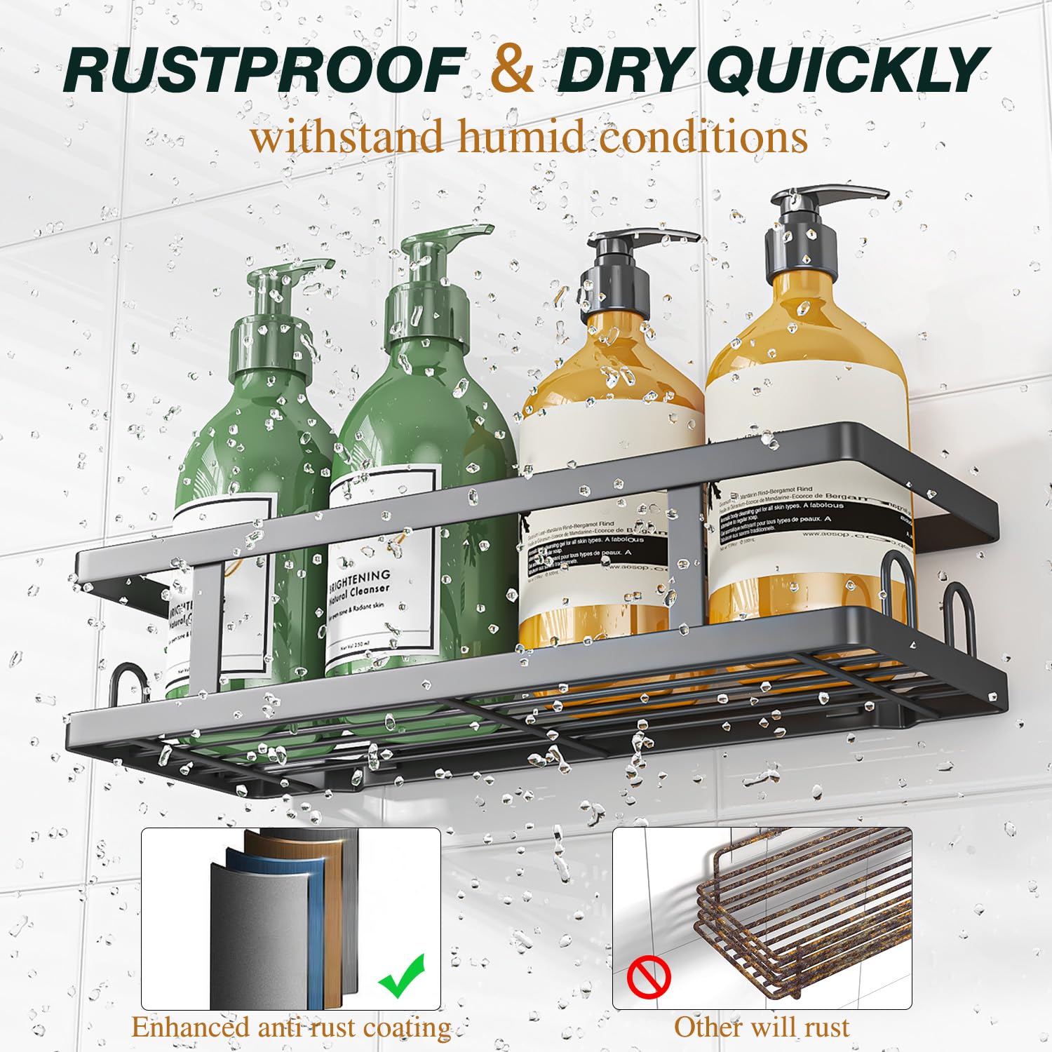 - Rustproof & Quick Drainage: This shower shelves made of high-quality metal and have a high-temperature paint process to scratch resistant, waterproof, rustproof in steamy shower conditions.The hollow at the bottom of shower rack can effectively drain water, keeping your shower supplies clean and dry