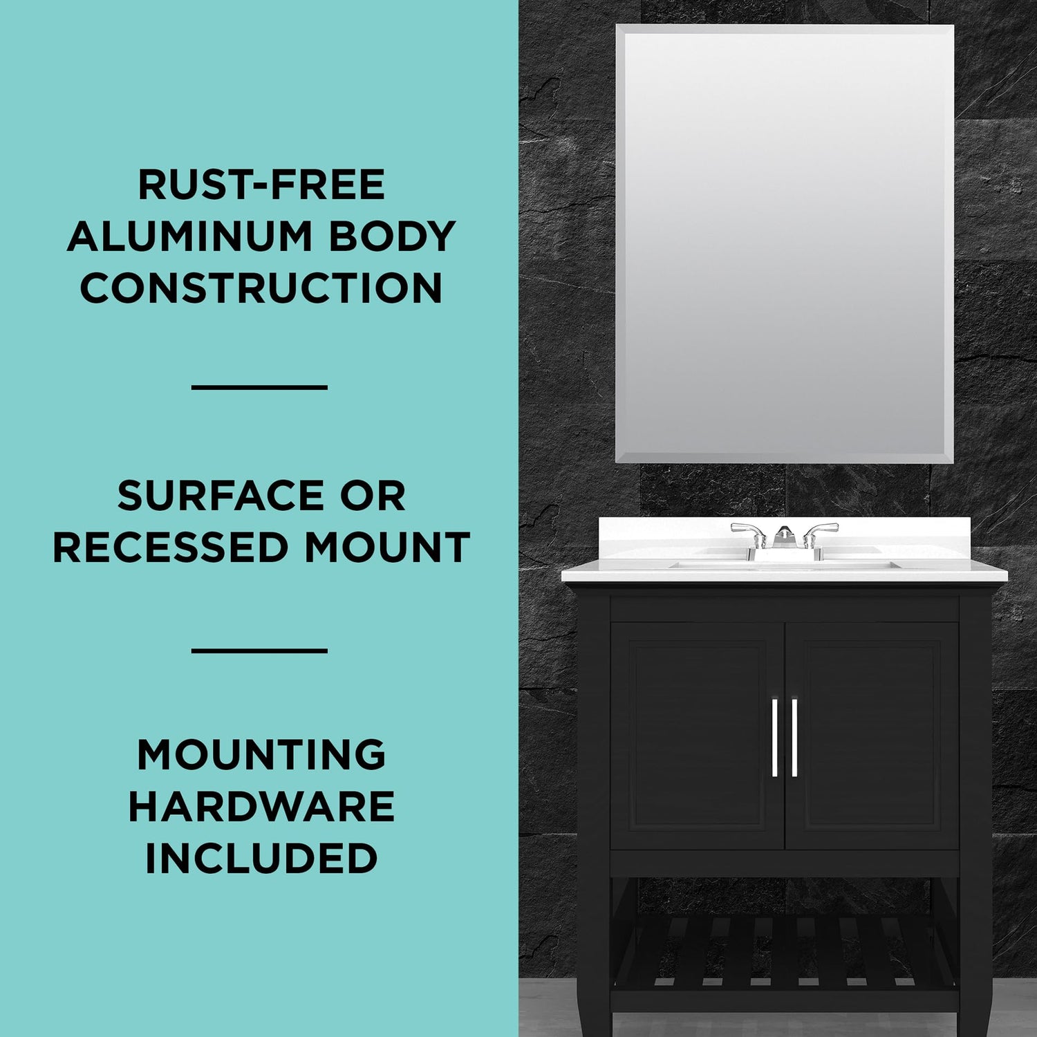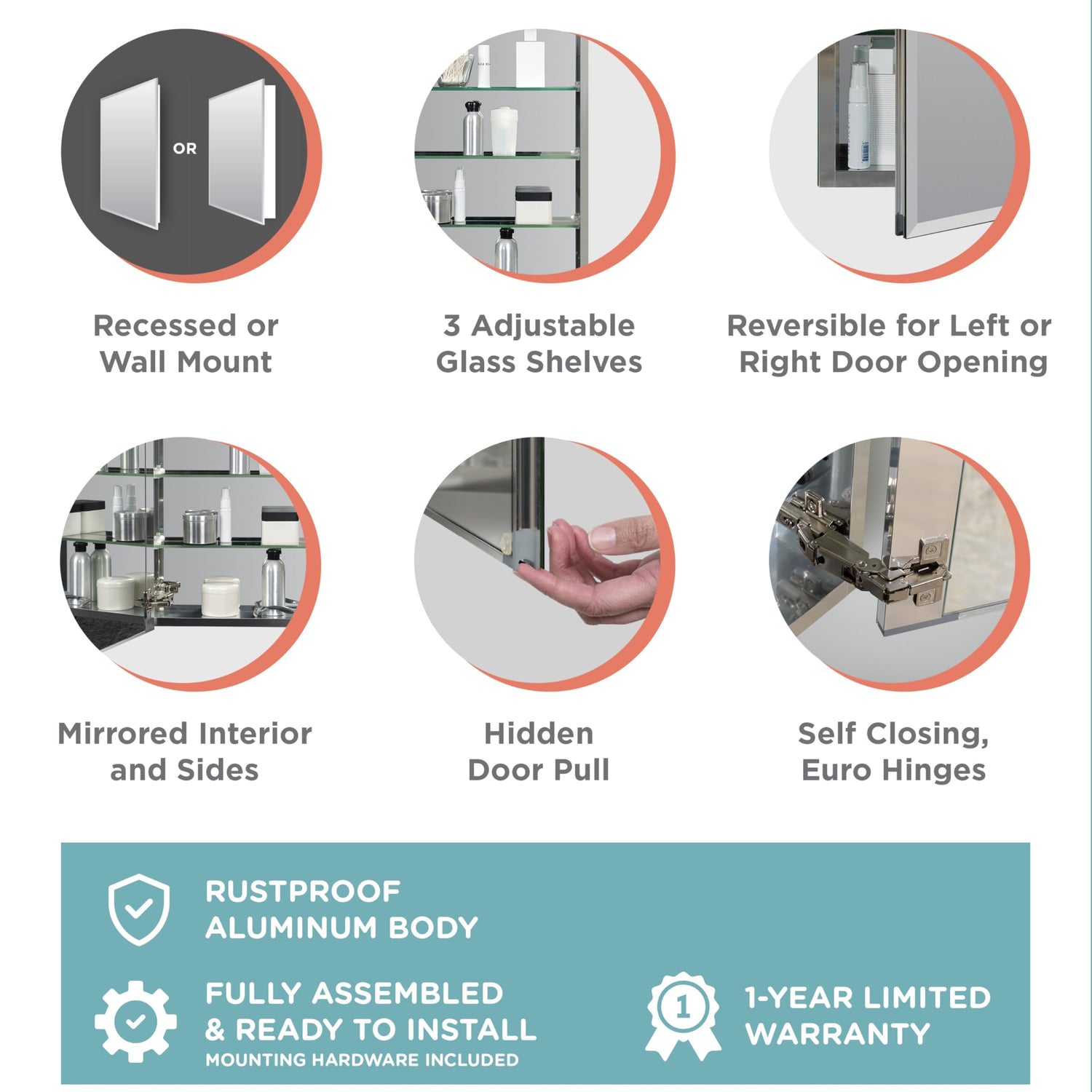 - Everyday Durability and Convenience: The rustproof aluminum body resists corrosion in humid bathrooms. Three adjustable glass shelves offer flexible storage, and the reversible mirrored door with Euro hinges ensures smooth, quiet use.