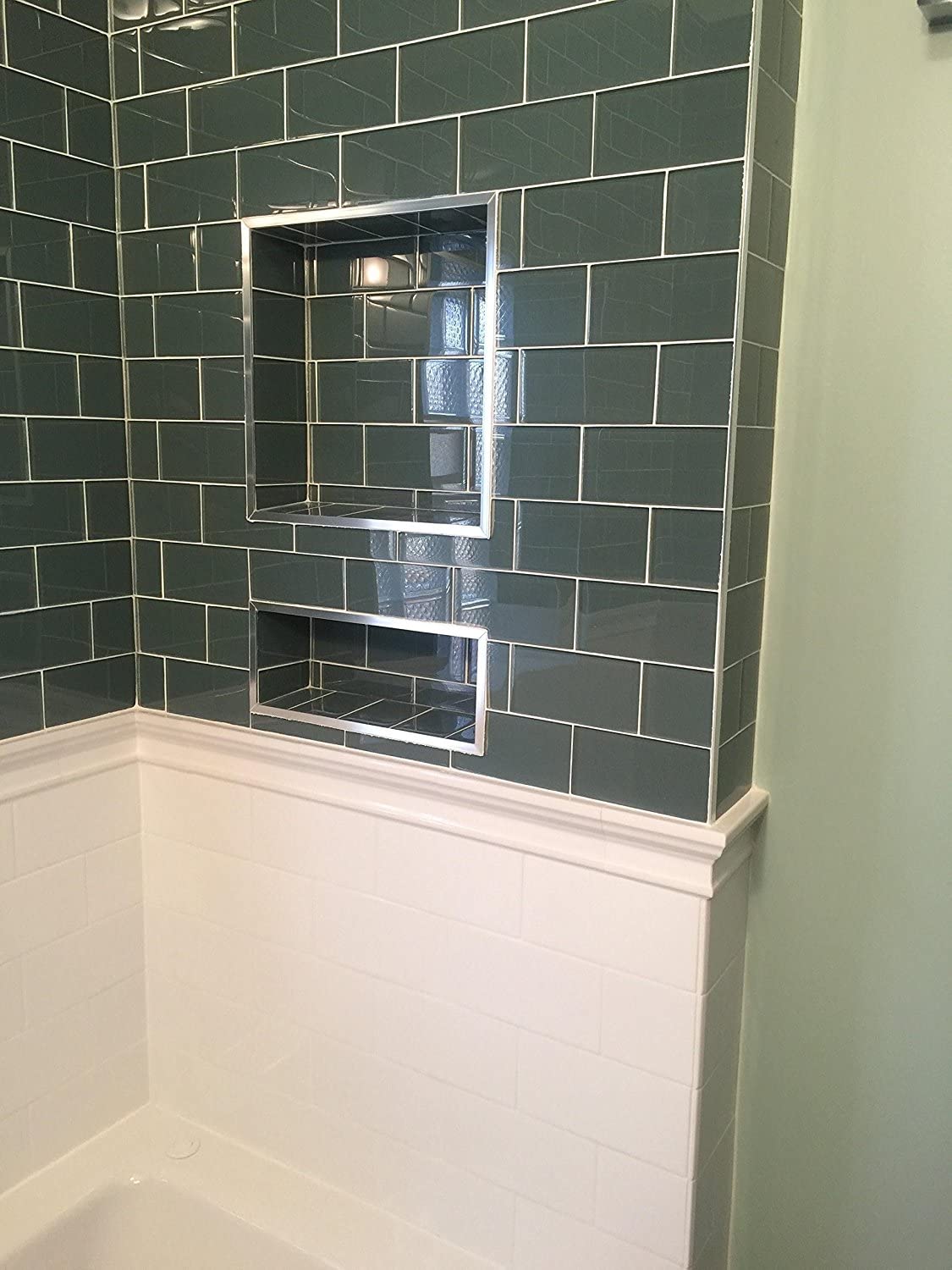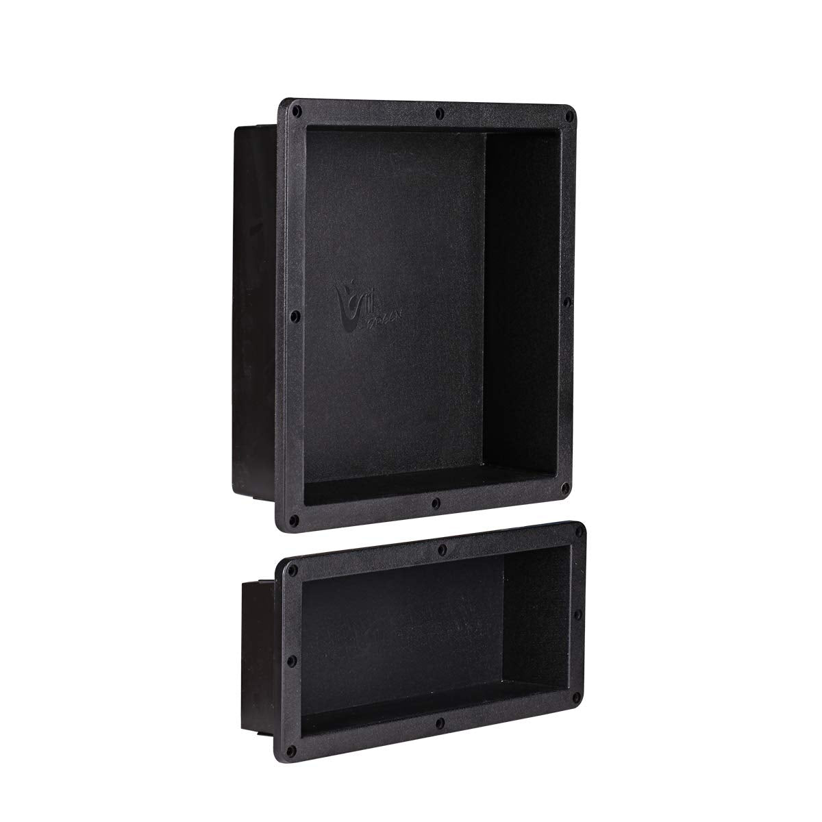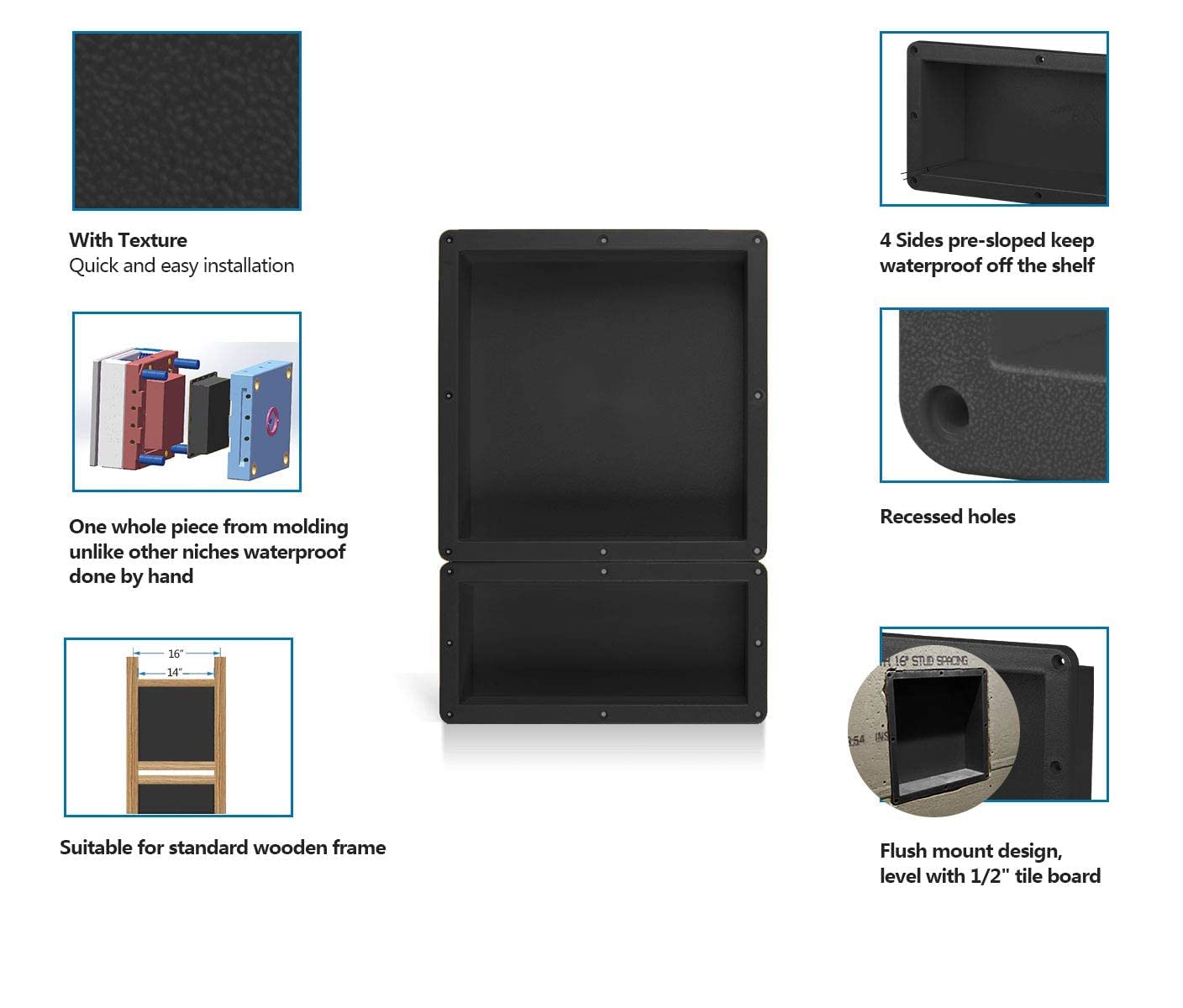Details: Overall Dimension: 23.33”×15.64”×4” | Inside Dimension①: 14" x 14" x 3.88" | Inside Dimension②: 14" x 6" x 3.88" 100% WATERPROOF: We have the product done by injection molding which the part is to be one whole piece, no penetration of water, no leakage and 100% waterproof. 10 YEARS GURANTEE: Made by light weight and durable ABS material, will not rust and leak. DESIGN BY AMERICAN PROFESSION TEAM: Round corners, no sharp edge with safety; 4 side pre-sloped keep water off the shelf. EASY INSTALLATION: Surface with texture friendly with thinset application and easy for tile, stone or mosaic tile.