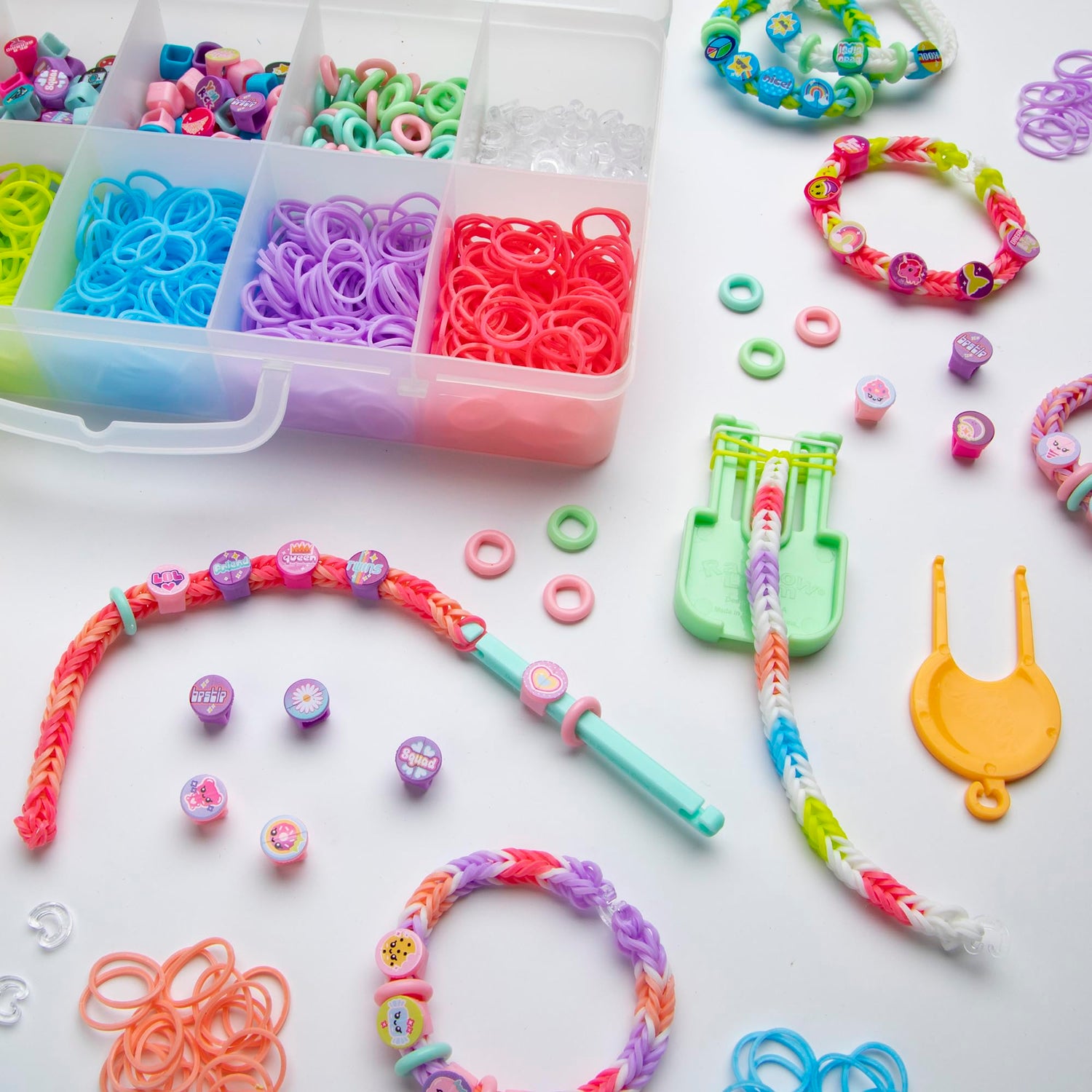 Details: BEADMOJI: MINI COMBO - Beadmoji are unique beads that feature fun messaging and icons that allow you to decorate your rubber band jewelry with a wide variety of trendy themes. Beadmoji features our new speed loom and dual hook allowing you to create rubber band bracelets twice as fast. Create your own style by mixing and matching your rubber bands with 150 beads to chose from! Beads come in these popular kid-friendly themes: Sweets, Fairy Tale, Good Vibes, Besties, and Trendy. Use these cute beads to create hundreds of customizable bracelets to keep and wear or share with friends and family! Easy to use and includes all tools to add the beads to your bracelets. All authentic Rainbow Loom products meet US Toy Safety Standards for being Phthalates-free, Lead-free, Cadmium-free, Chromium-free, Mercury-free, and Arsenic-free! KIT INCLUDES: 1800 Bands, 150 Beadmoji Beads, 110 Spacers, 2 Beadmoji Hooks, 2 Speed Looms, 2 Dual Hooks, 50 C-Clips and easy to follow instructions recommended for ages 7 and up. RAINBOW LOOM: Beadmoji is created by the award winning Rainbow Loom! Craft products are ideal for developing fine motor skills and cognitive thinking. Inspiring kids to spread kindness through creativity and sharing.