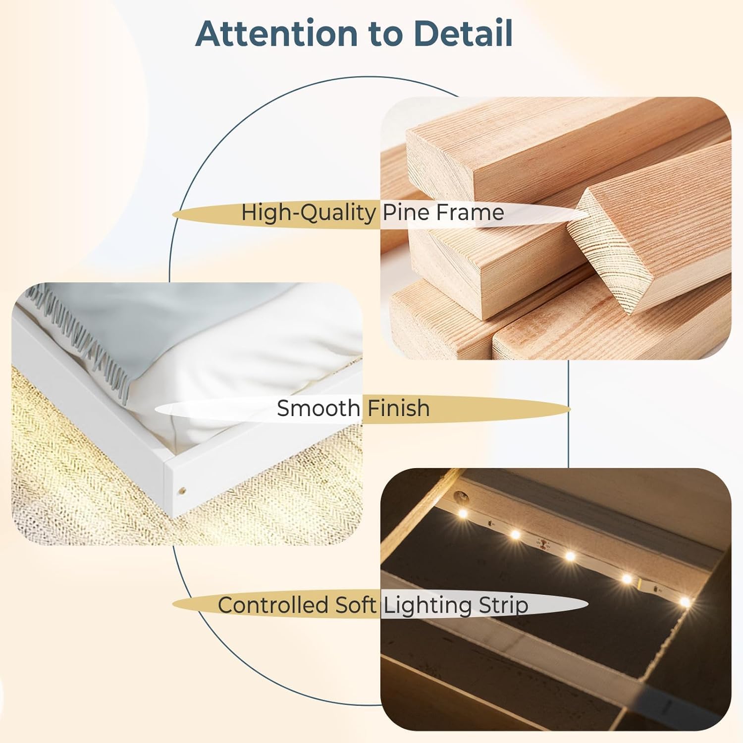One of the standout features of this platform bed is its enchanting floating effect, enhanced by subtle LED lights installed beneath the bed frame. These LED lights cast a gentle glow on the floor, creating a warm, inviting atmosphere that transforms your bedroom into a tranquil retreat. The clever design, which conceals the bed legs, creates the illusion of a bed floating effortlessly in the air, adding a unique visual element that will impress guests and enhance your living space.