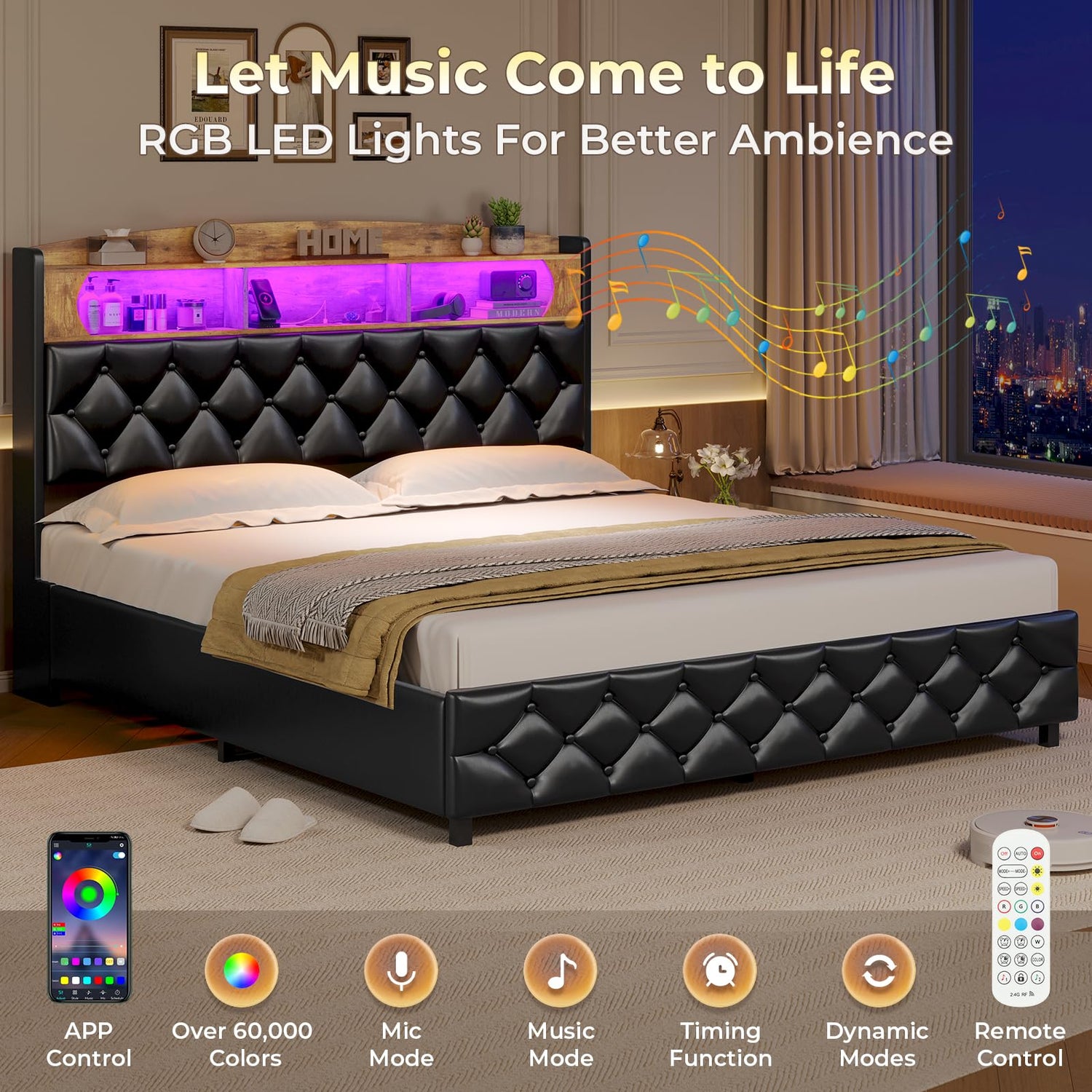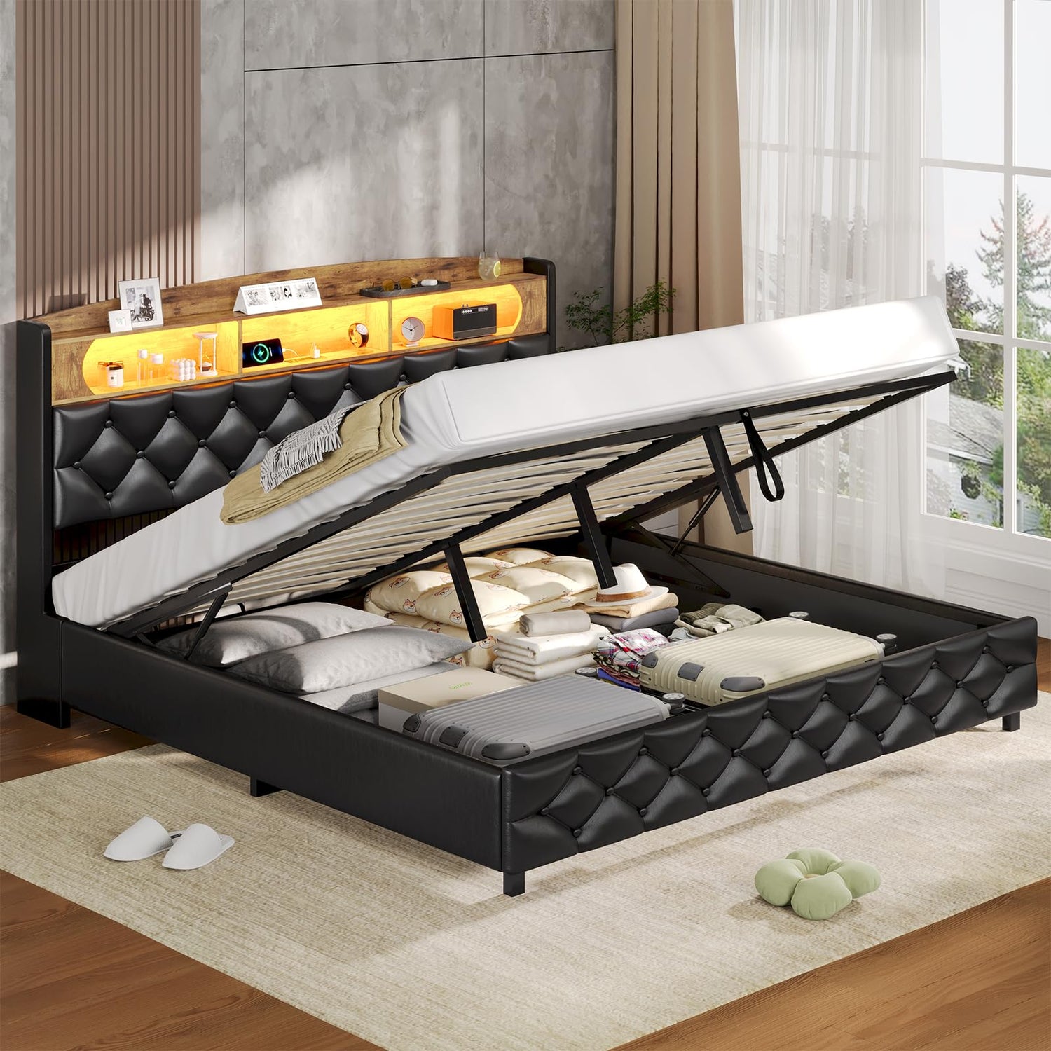 ADORNEVE Queen Bed Frame with LED Headboard, Hydraulic Lift Storage, and Built-in Charging Station in PU Black