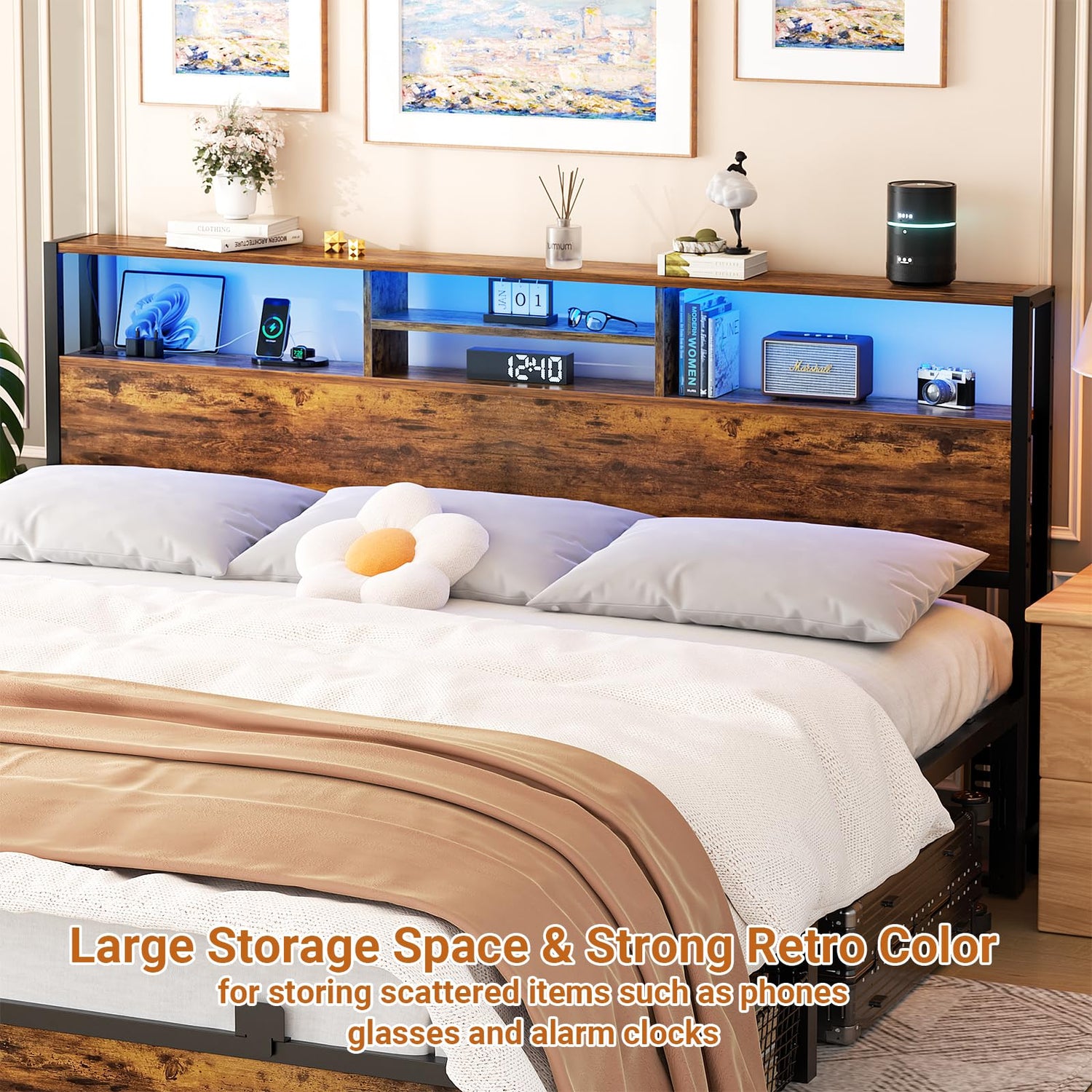 Aheaplus Rustic Brown King Size Headboard with Storage, USB Ports, LED Light and Adjustable Design