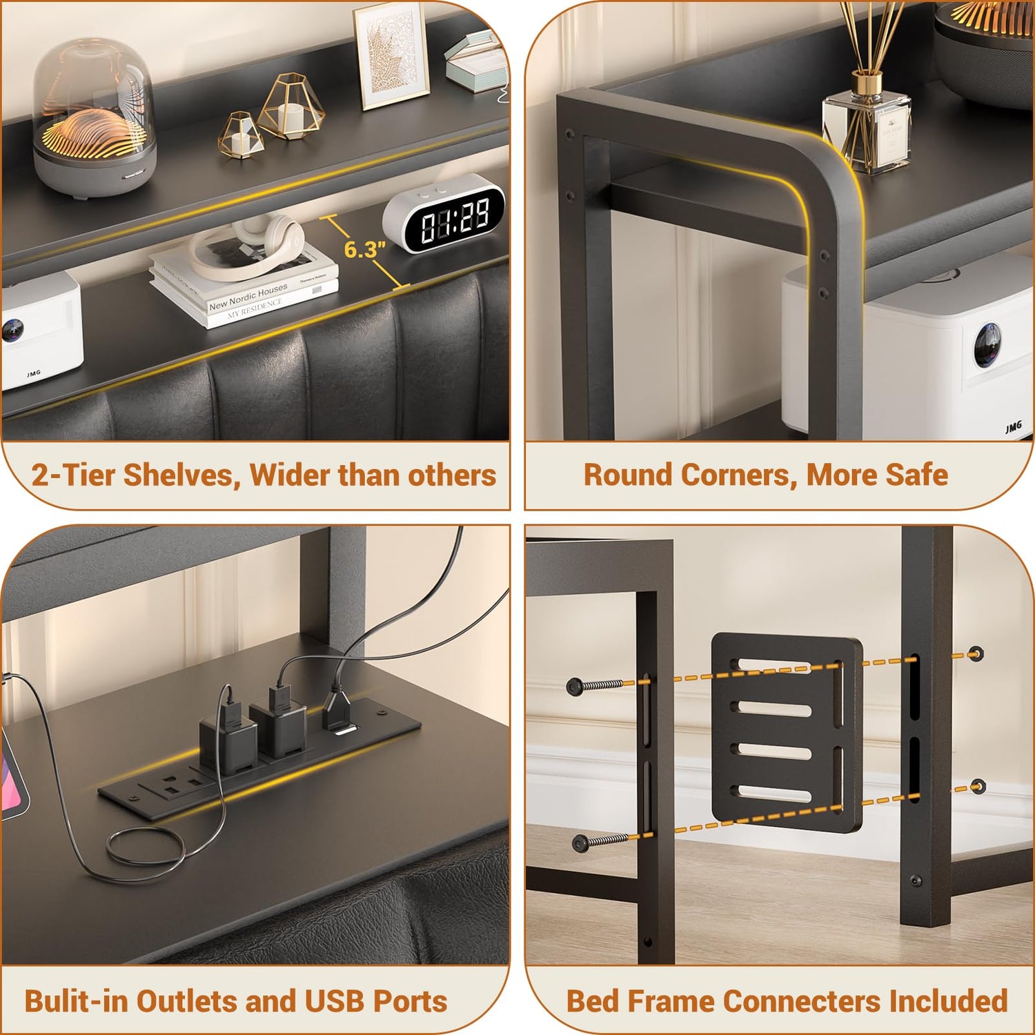 The stylish design features a wood and black iron frame that adds a touch of retro elegance to your room. With a practical two-tier shelf, your scattered items like phones and alarm clocks can now be neatly organised, contributing to a clutter-free space. This headboard even accommodates a small projector, turning your bed into a personal movie theatre.