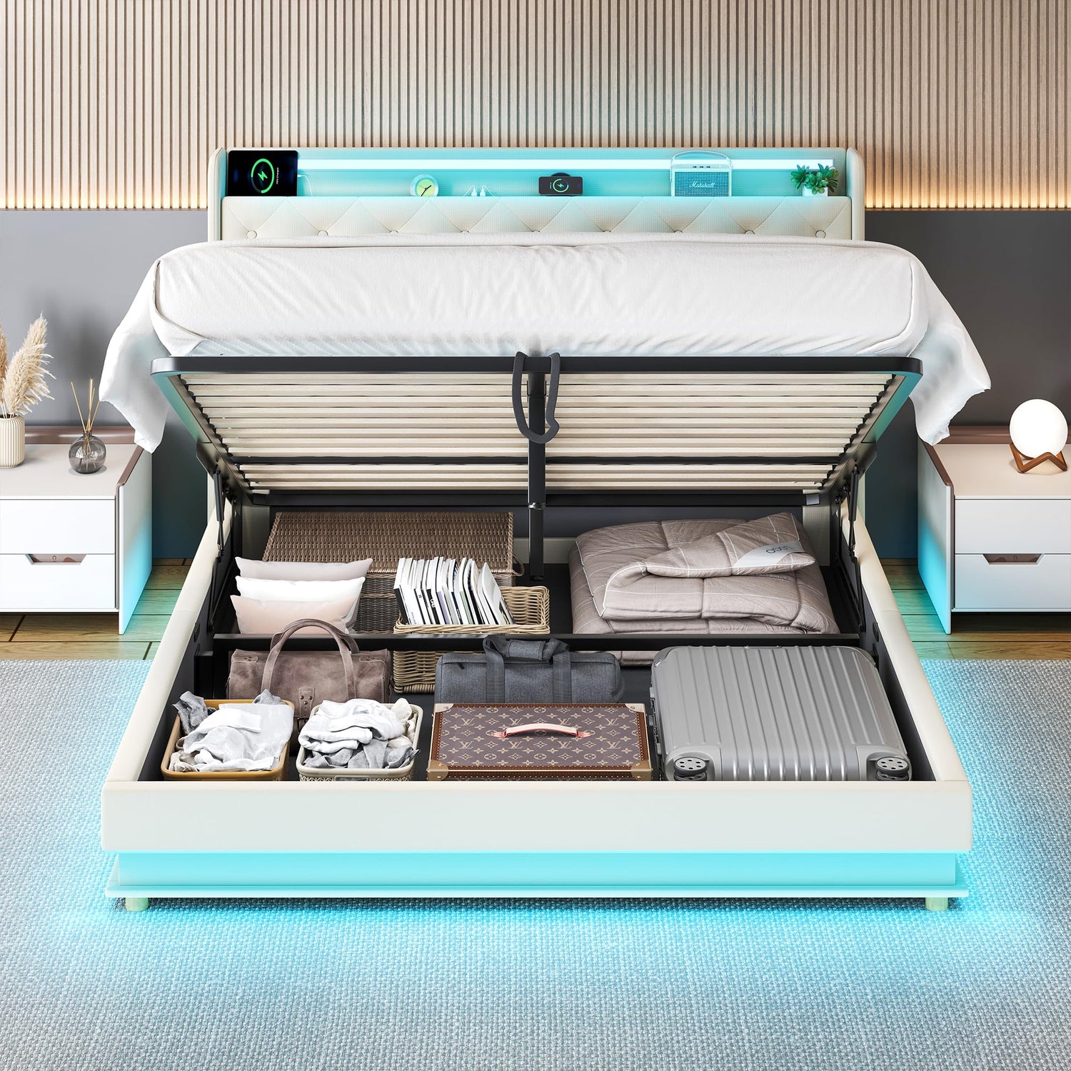 Ailisite Beige Upholstered Queen Bed Frame with LED Lights, Wingback Headboard, and Storage Solution