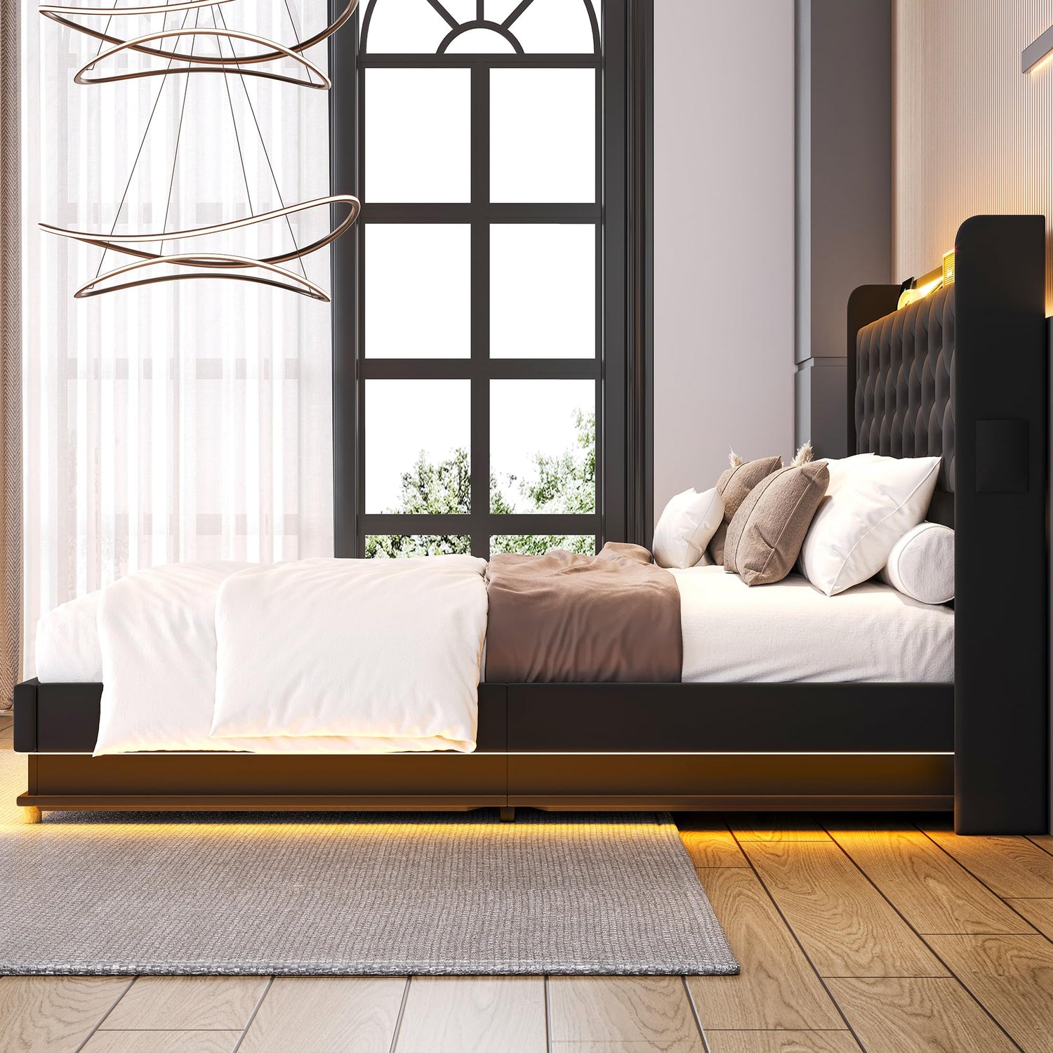 Ailisite Queen Lift-Up Storage Bed with Tufted Wingback Headboard and USB Charging Station, Black Upholstered Design