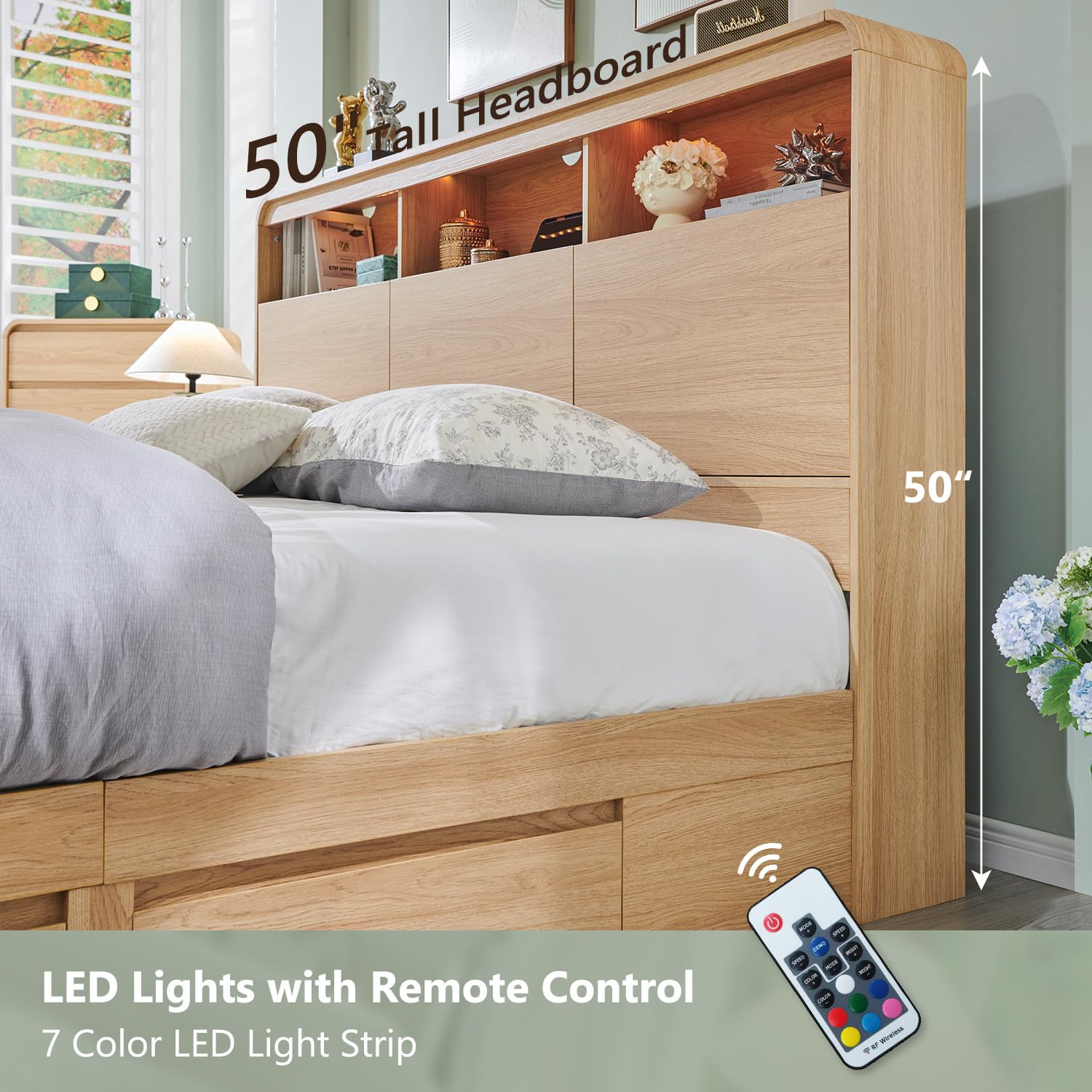 Aitjunz Modern King Size Bed Frame with 50" Tall Storage Headboard, Wood King Size Platform Bed Frame w/4 Drawers, Curved Profile Design,LED Light, Charging Station,No Box Spring Needed, Natural Oak