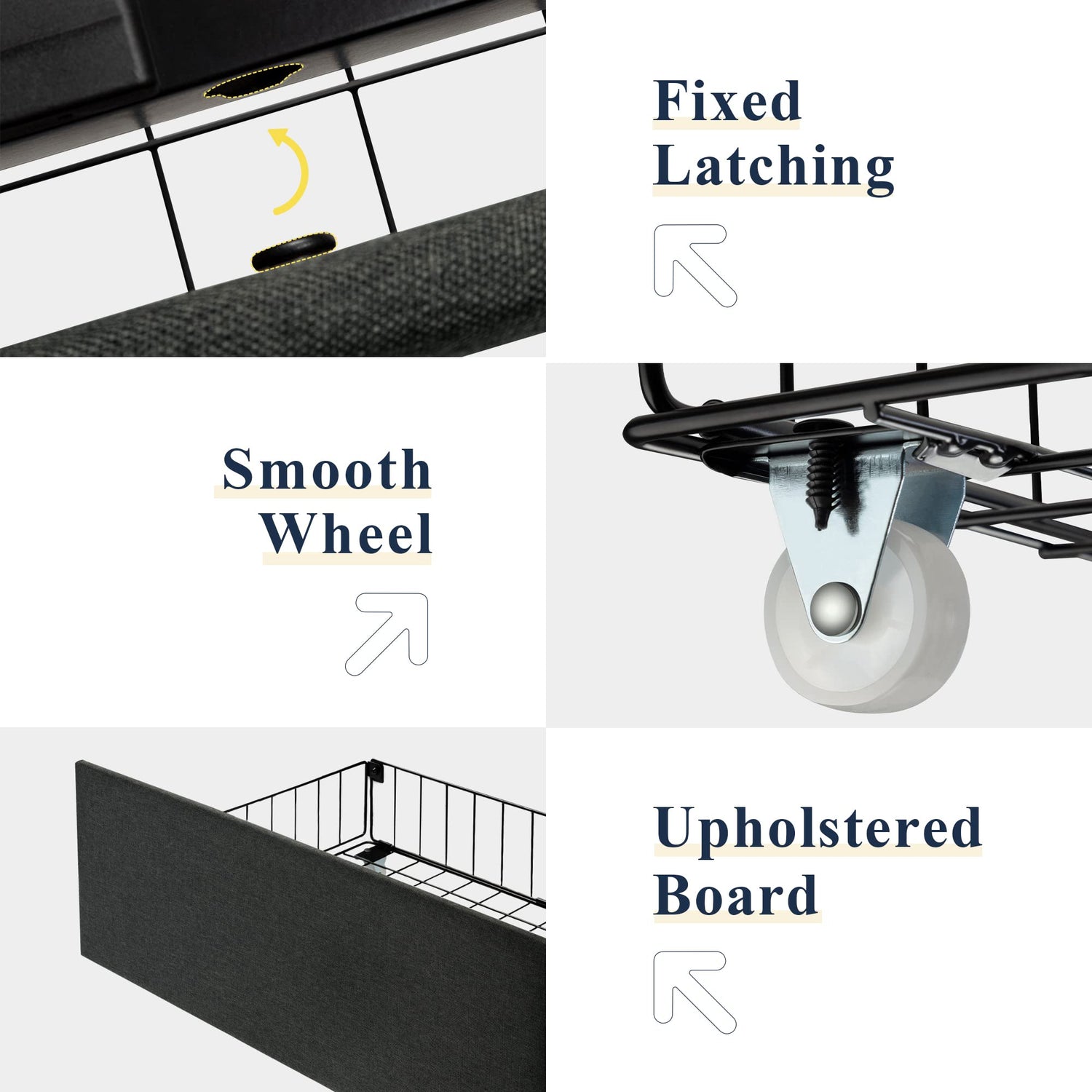 • UPHOLSTERED BED WITH DRAWER: Four invisible under-bed storage drawers with wheels, still maintain a fashionable appearance, no more worry about crowded closets