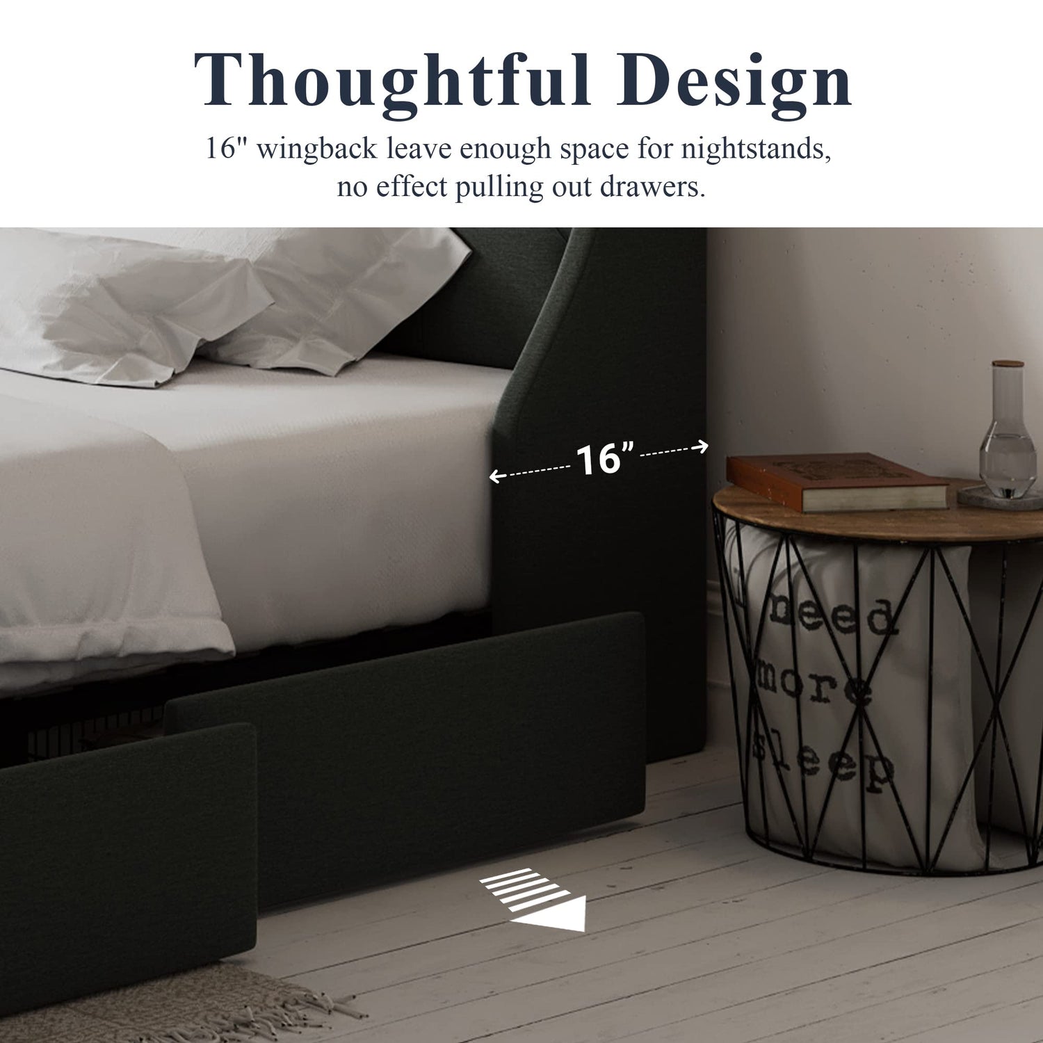 Allewie King Size Bed Frame with 4 Storage Drawers and Wingback Headboard, Button Tufted Design, No Box Spring Needed, Dark Grey